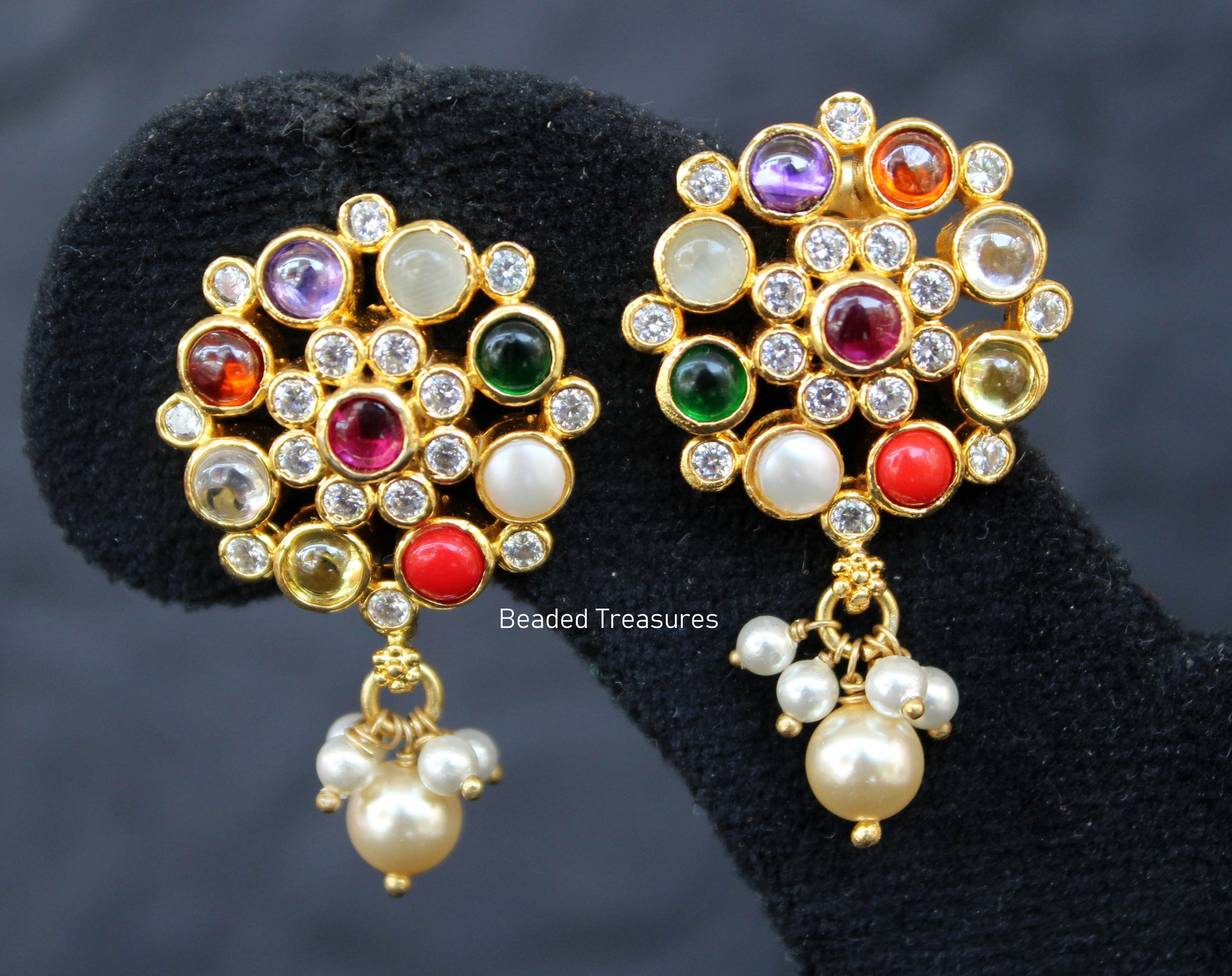 - Elegant Gold-Toned Earrings featuring a vibrant array of colorful gemstones and delicate pearl drops, handcrafted by Beaded Treasures in Bengaluru.