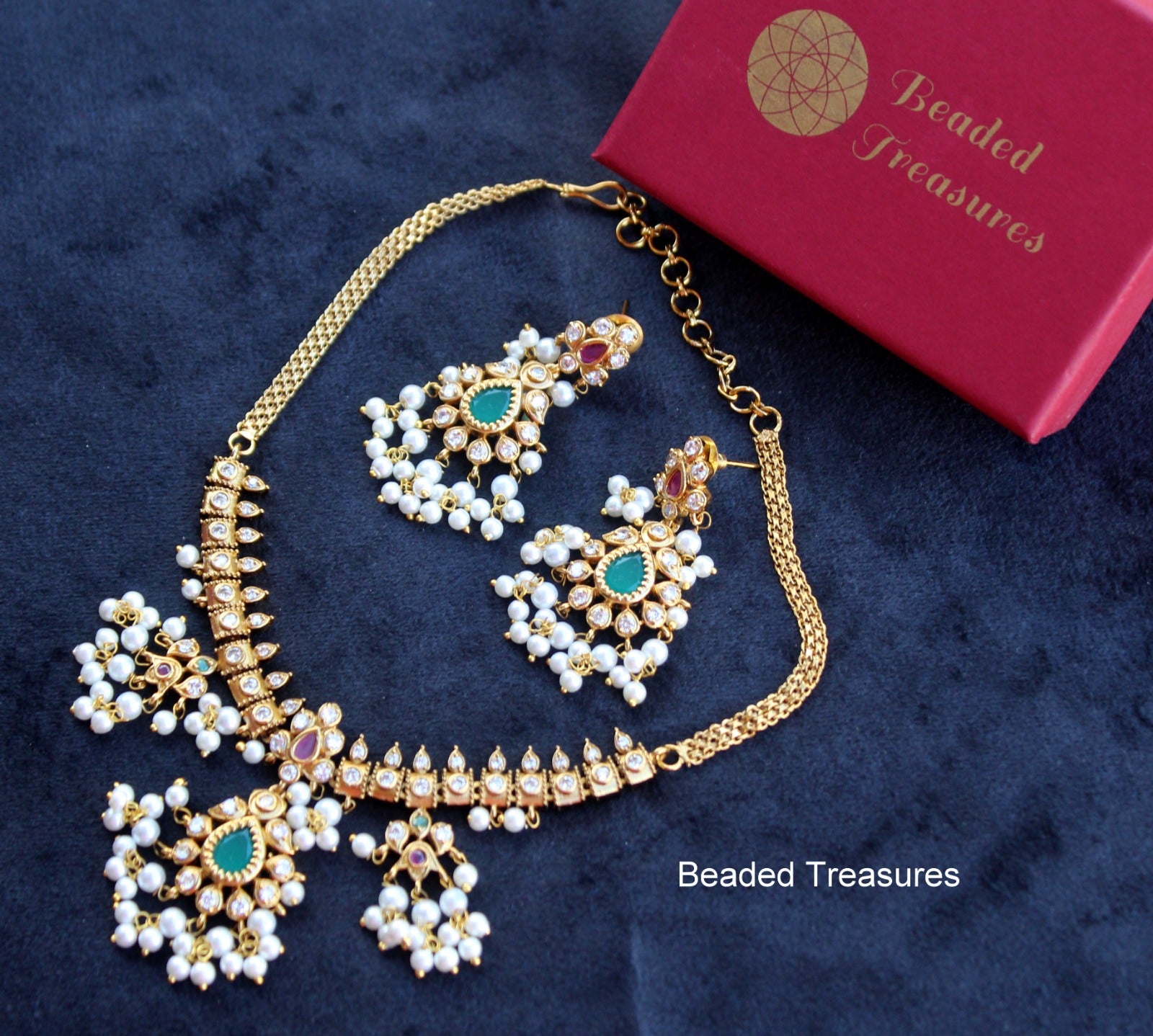 - Elegant Gold-Toned Necklace and Earring Set with Green and Red Stone Accents and Pearl Drops, handcrafted by Beaded Treasures in Bengaluru.
