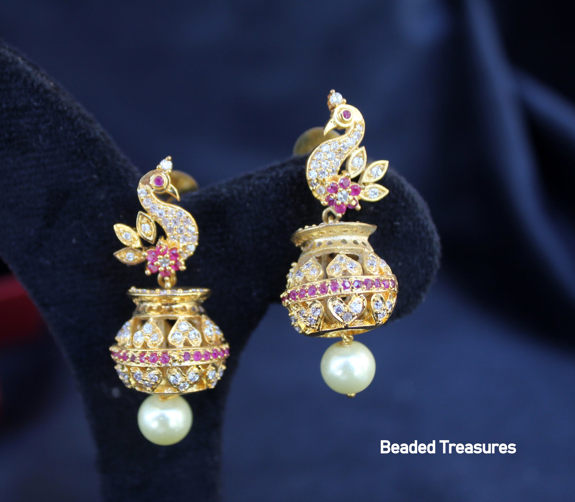 - Elegant Gold-Toned Peacock Design Pot Jhumka Earrings with Pearl Drops, handcrafted by Beaded Treasures in Bengaluru.