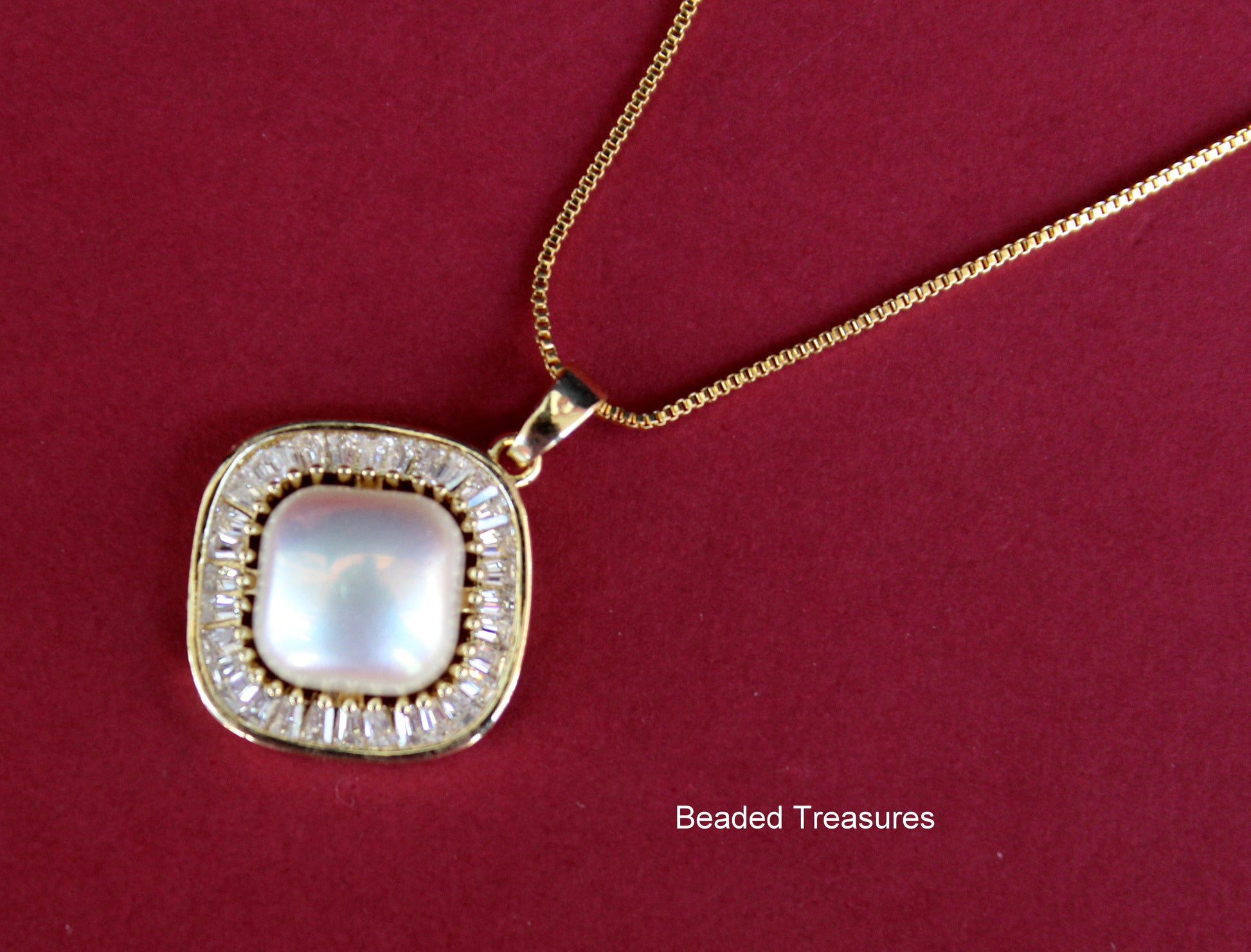 - Features a beautiful square pendant with a pearl-like gemstone and sparkling crystal accents, set on a thin gold-toned chain.