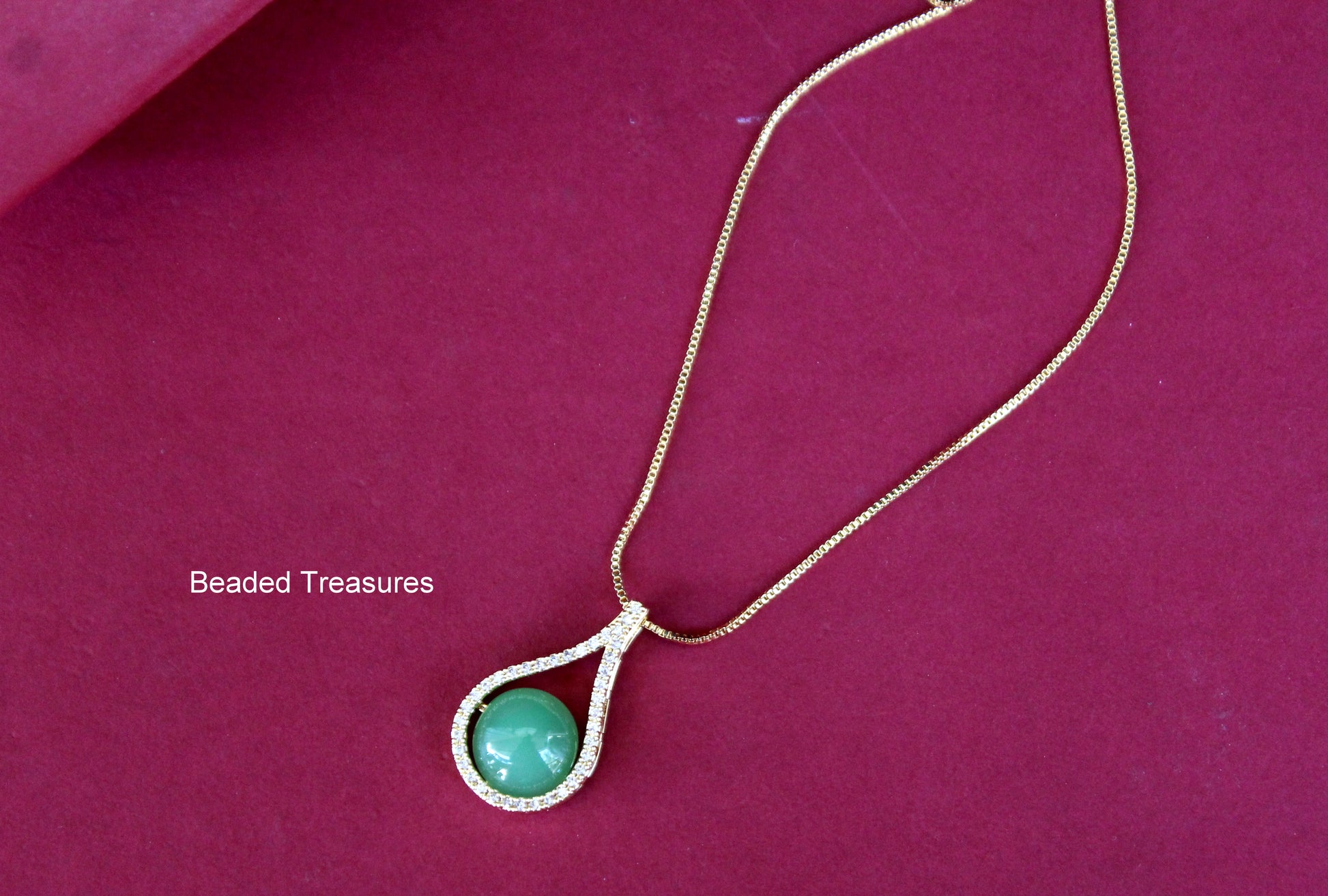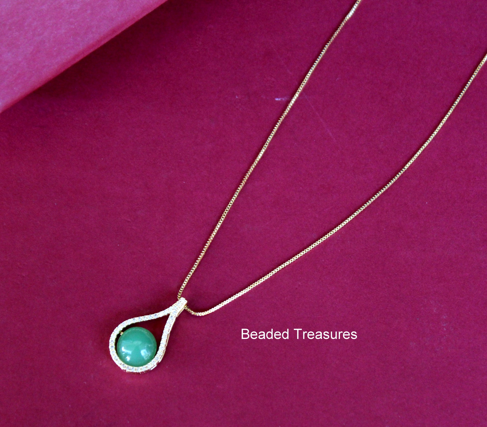 - Elegant Gold-Toned Teardrop Pendant Necklace with Green Stone Accent, handcrafted by Beaded Treasures in Bengaluru.