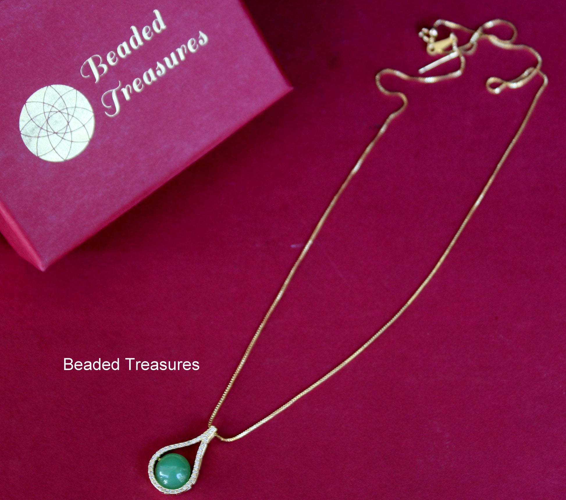 Gold-Toned Teardrop Pendant Necklace with Green Stone - Beaded Treasures