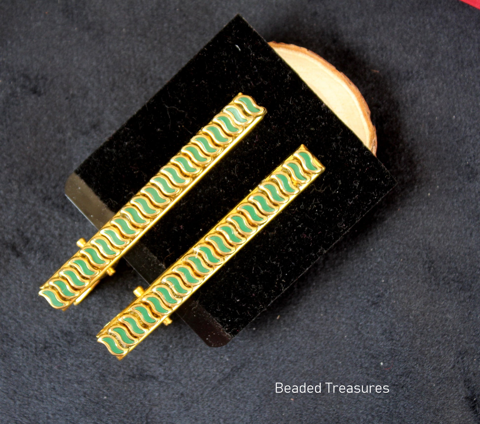 - Unique Green Stone Hair Clips with Wavy Design, handcrafted by Beaded Treasures in Bengaluru.