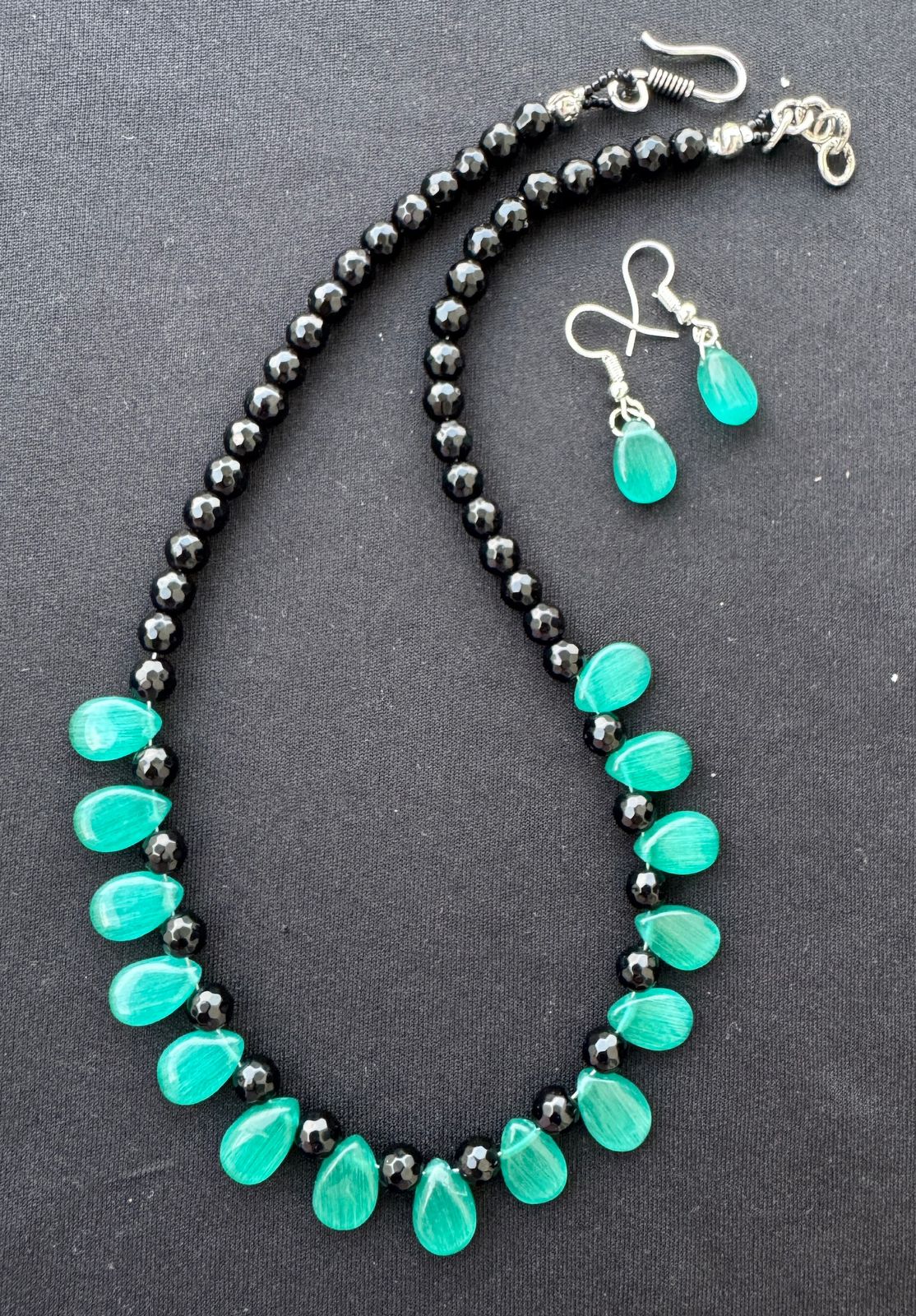 Unique and handcrafted necklace set featuring polished black onyx beads and beautiful teardrop-shaped green cat's eye beads.