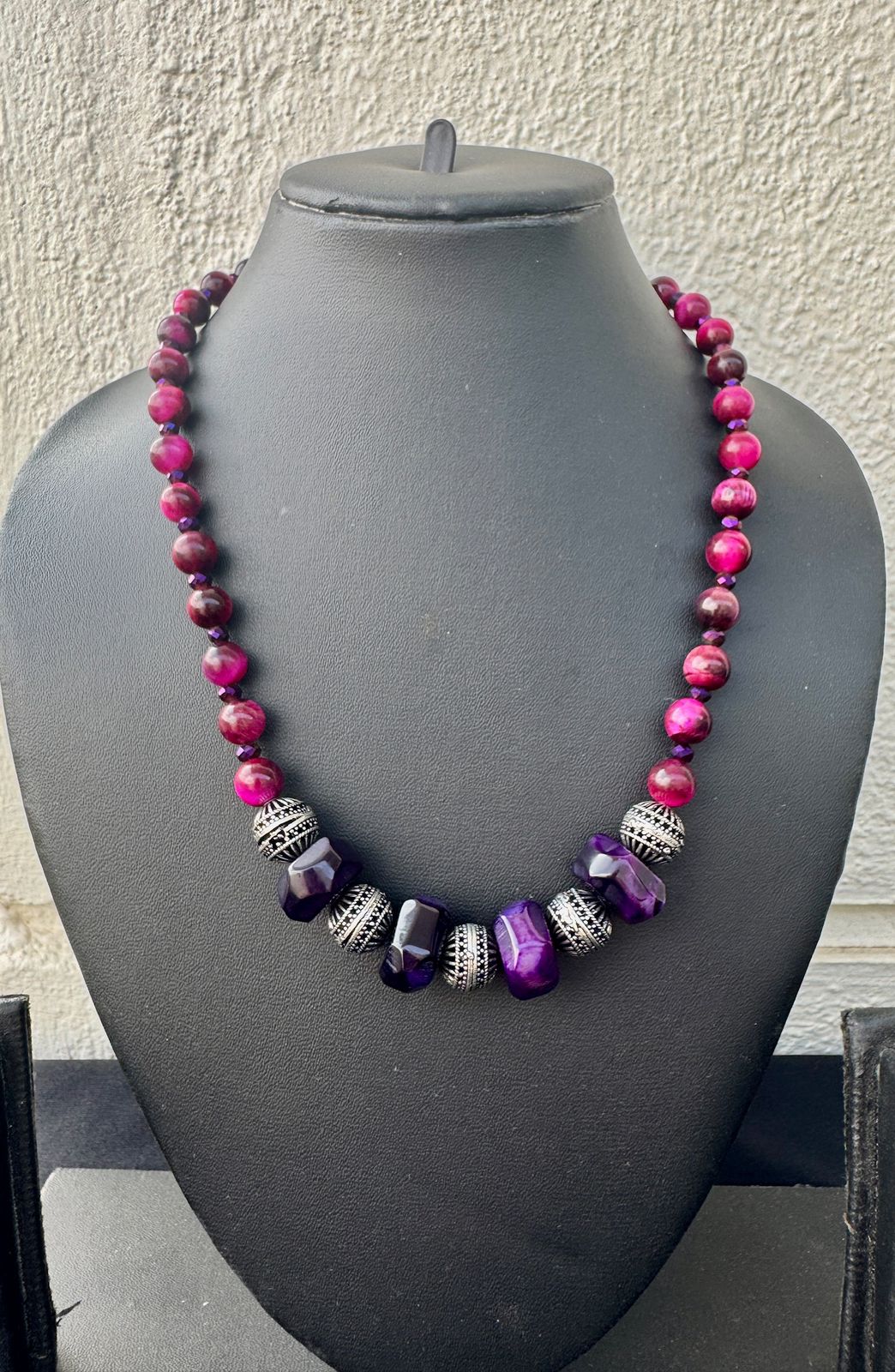 Smaller pink and purple tiger's eye beads complete the rest of the necklace strand.