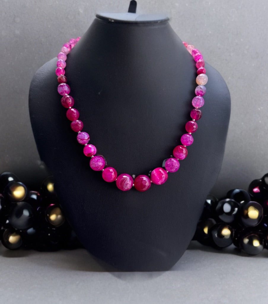 - Elegant and vibrant single-strand necklace featuring polished pink agate beads, handcrafted by Beaded Treasures in Bengaluru.