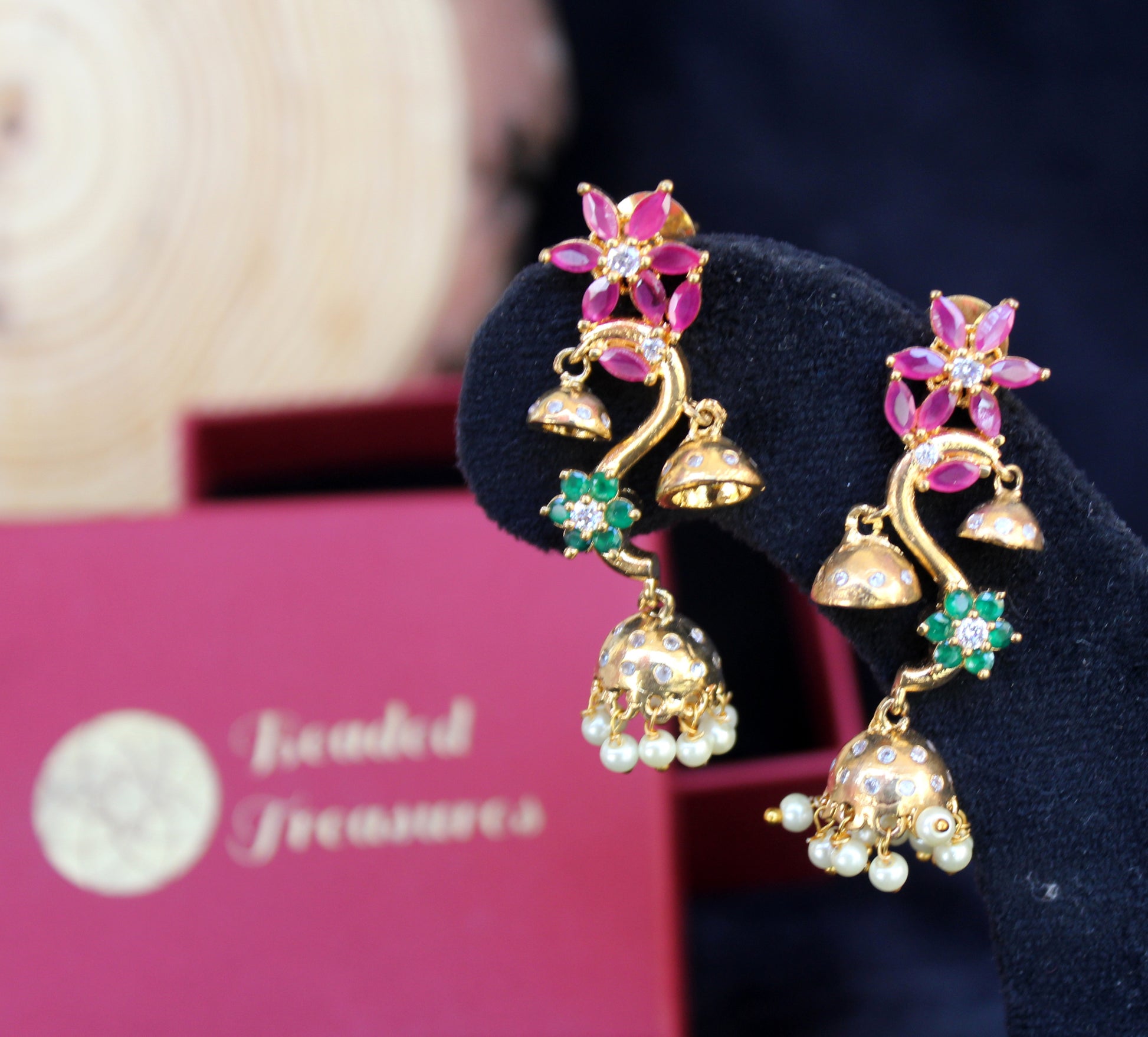 - Features a beautiful design with a floral motif at the top adorned with vibrant stone accents (ruby-like), followed by a gold-toned stem with green stone accents, and a classic jhumka dome with pearl drops.