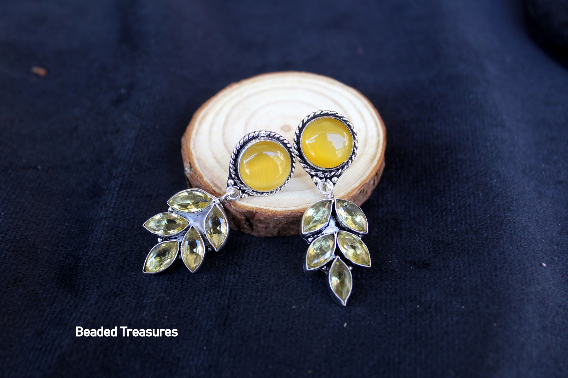 - Unique JIVA Drop Long Yellow Garnet German Silver Earrings, handcrafted by Beaded Treasures in Bengaluru.