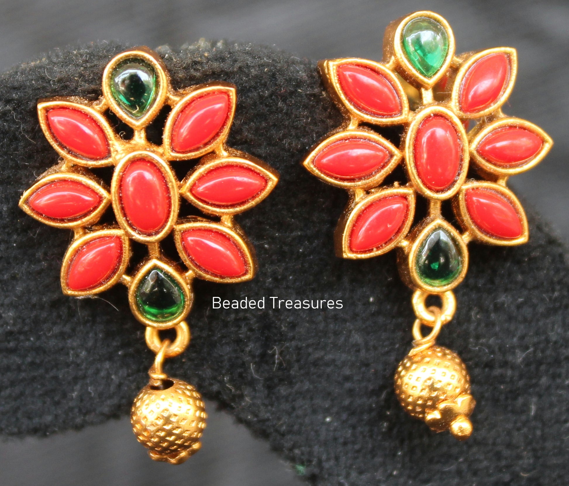 - Features a beautiful flower design with vibrant Kemp (red) stones forming the petals and contrasting green stones accenting the design. A delicate gold bead drop adds a touch of movement.