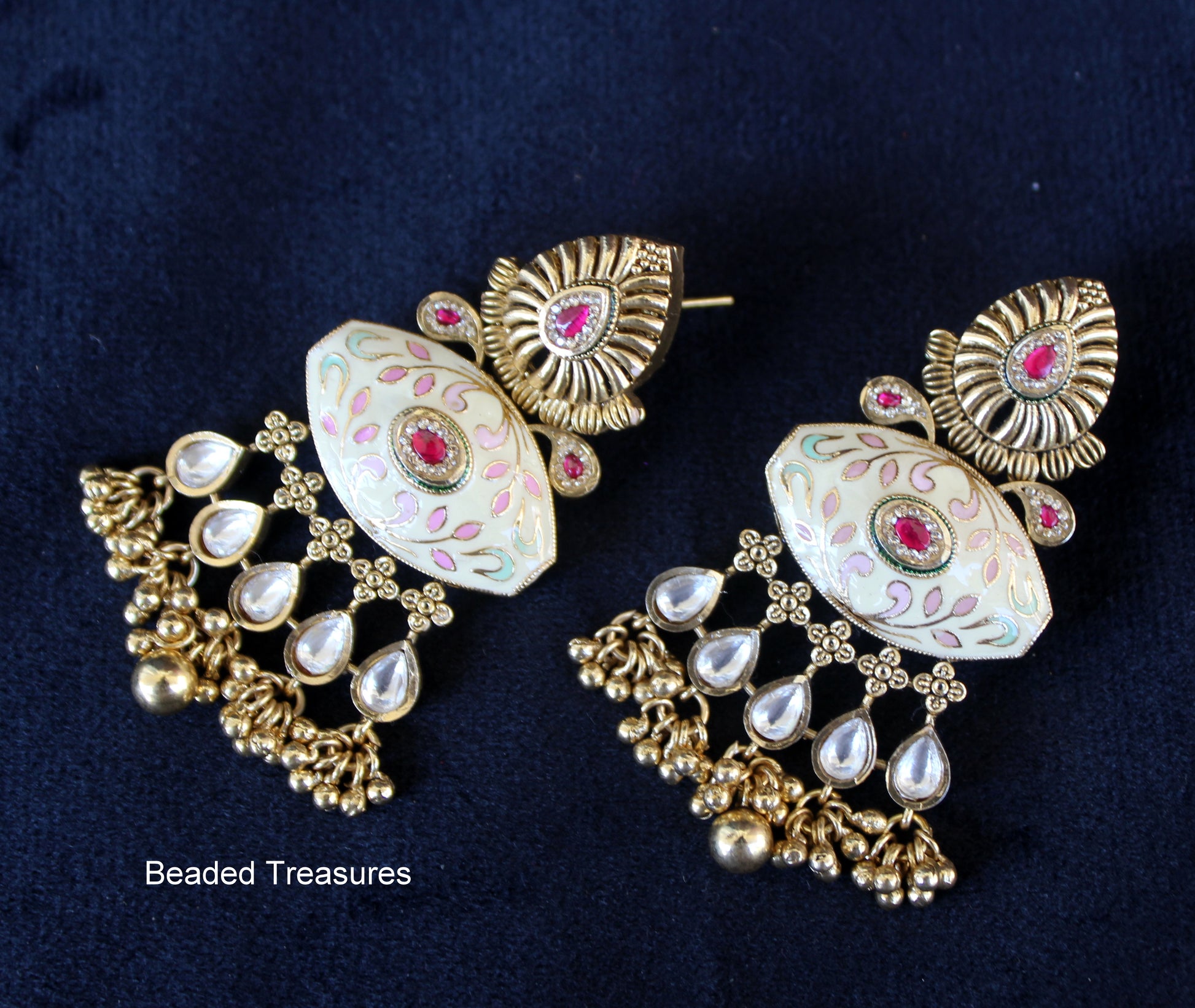 - Exquisite Kundan Jhumki Earrings, handcrafted by Beaded Treasures in Bengaluru.