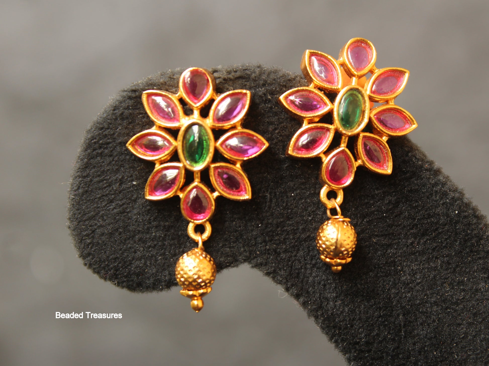 - Elegant pair of earrings featuring a floral design with vibrant Kemp (ruby-like) and emerald-like stones set in a beautiful matte gold plated frame, finished with delicate gold bead drops, handcrafted by Beaded Treasures in Bengaluru.