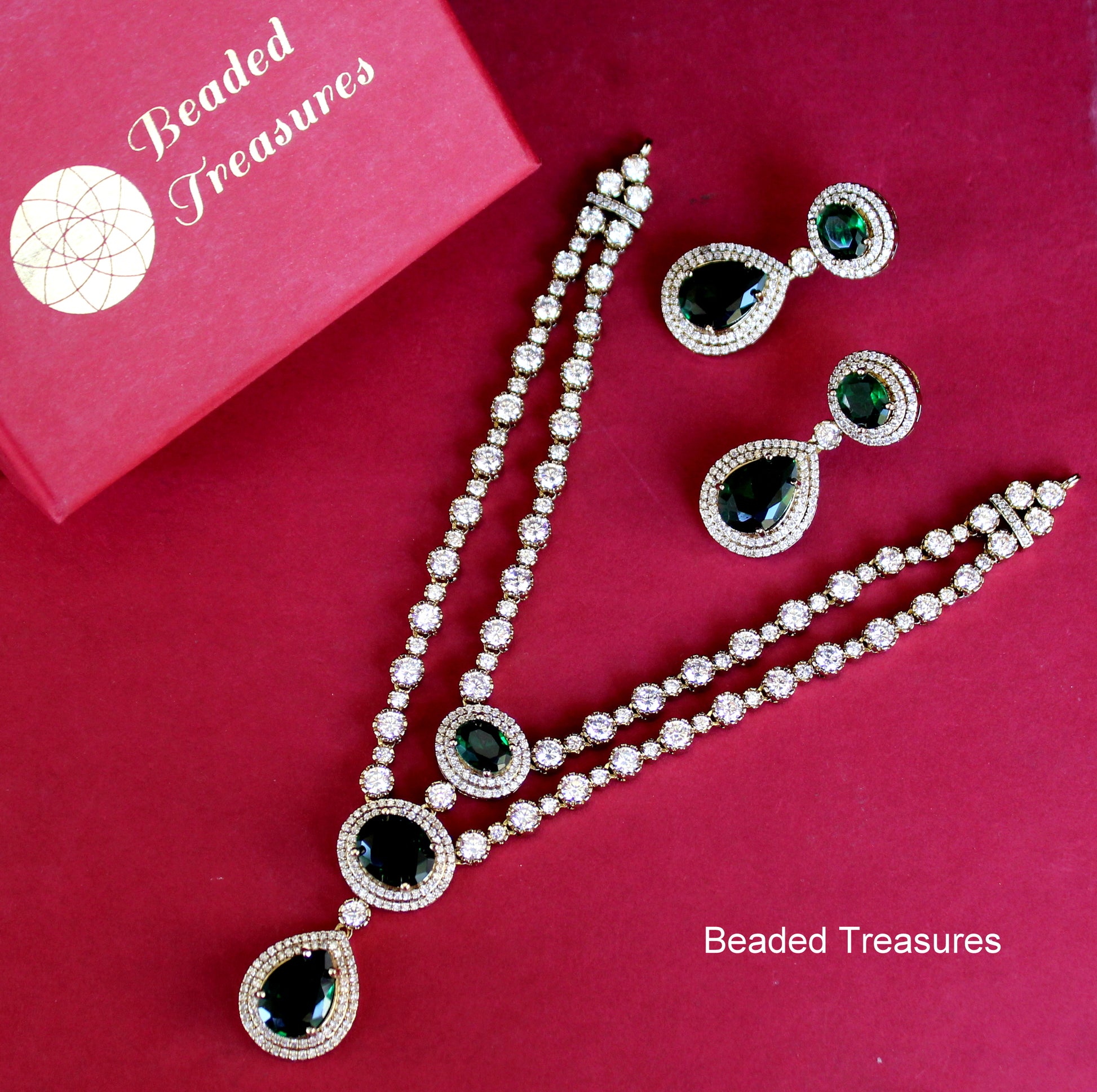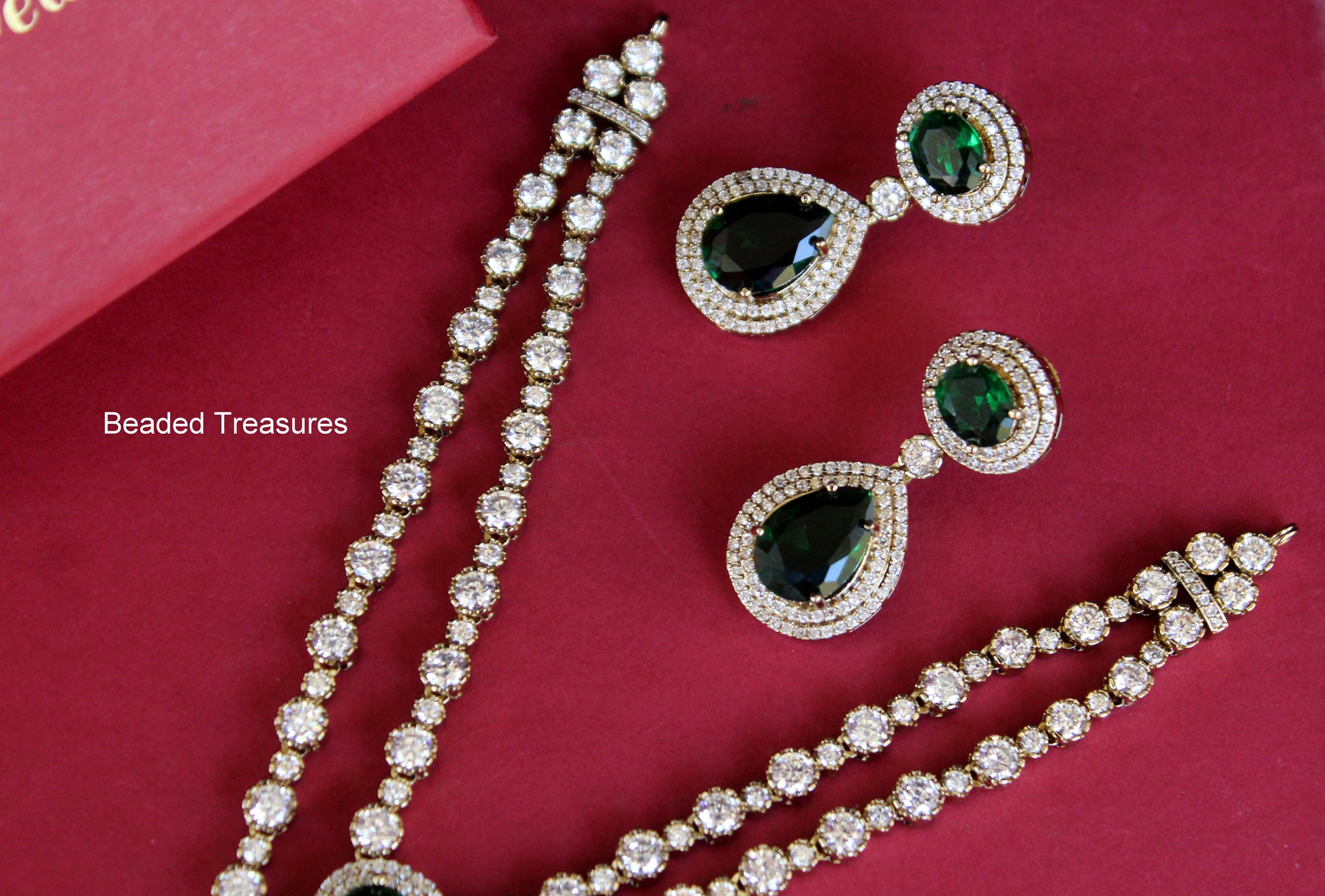 - Exquisite Moissanite Necklace and Earring Set with Green Stone Accents, handcrafted by Beaded Treasures in Bengaluru.