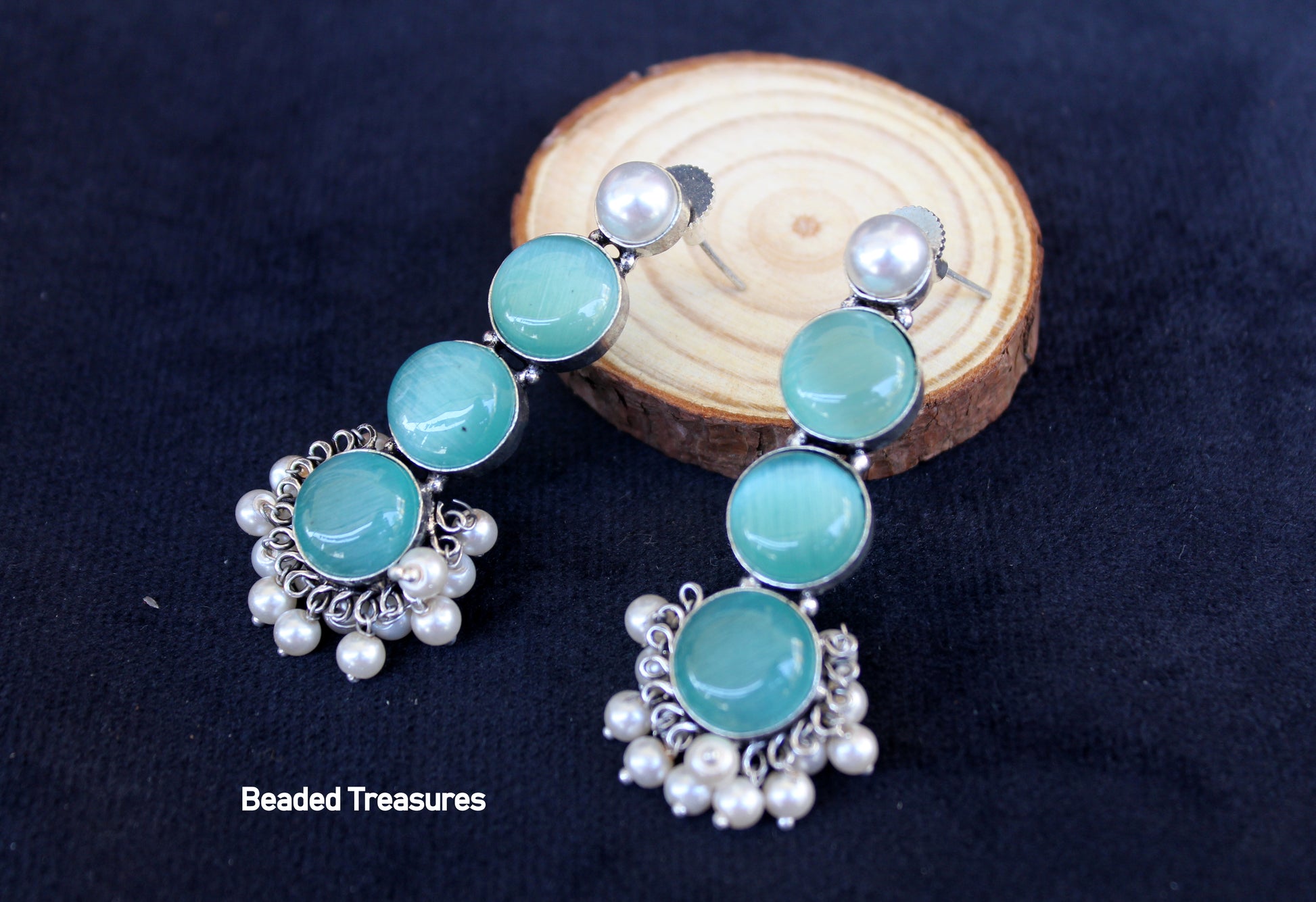 - Elegant Monalisa Stone Stud Earrings with Pearl Accents, handcrafted by Beaded Treasures in Bengaluru.