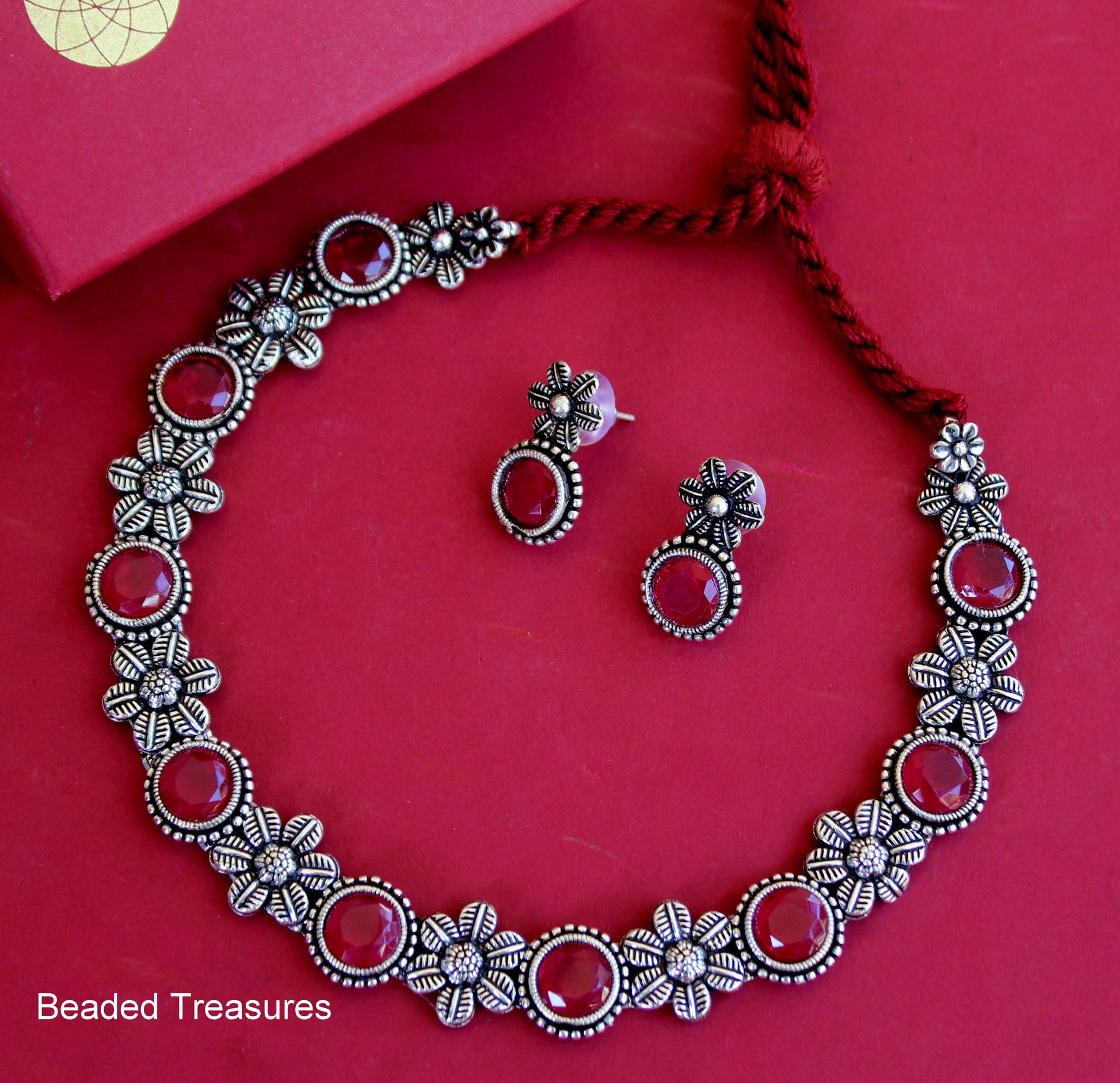 - Elegant Oxidised Silver Ruby Stone Necklace Set, crafted by Beaded Treasures in Bengaluru.