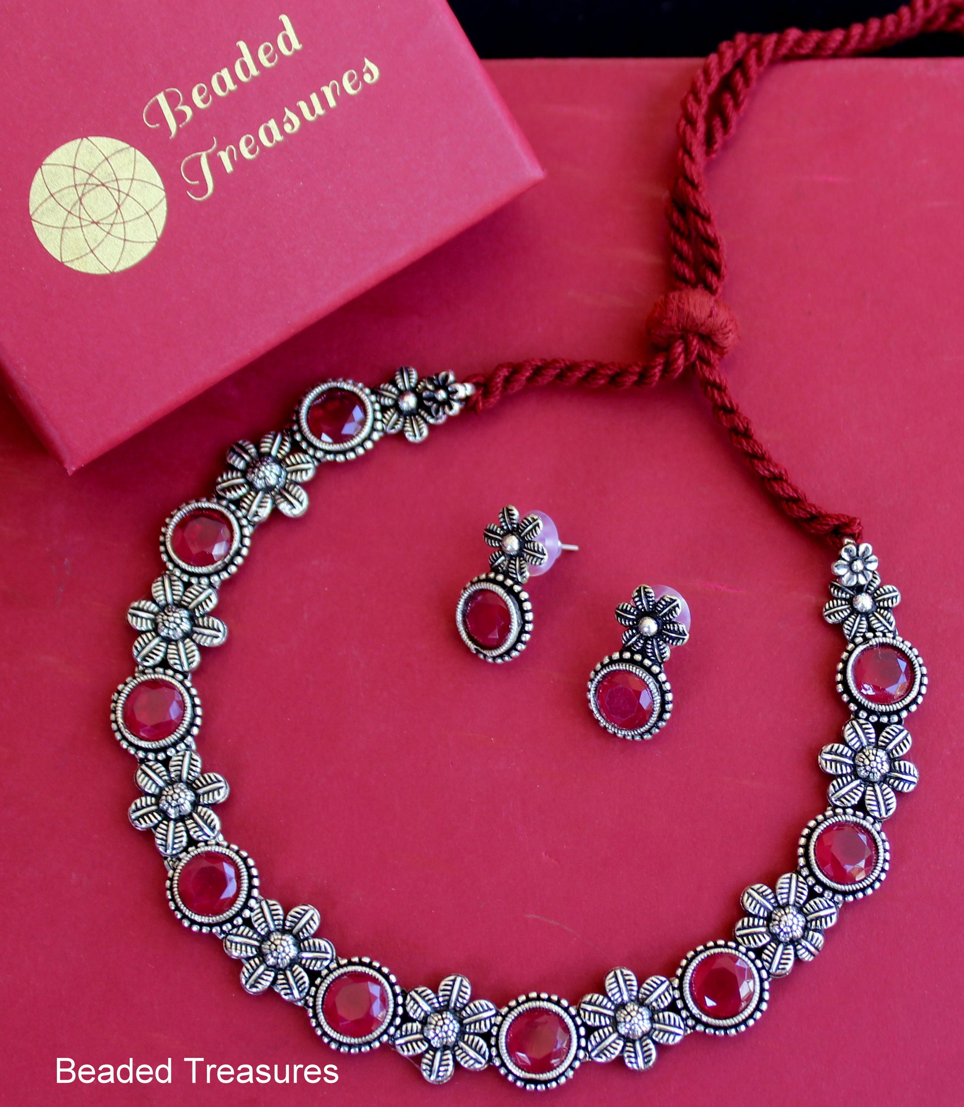 Oxidised Silver Ruby Stone Necklace Set - Beaded Treasures
