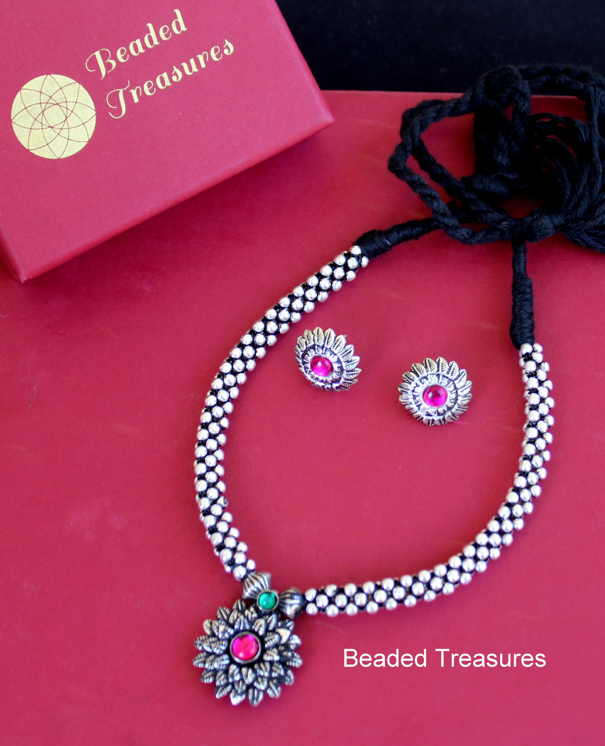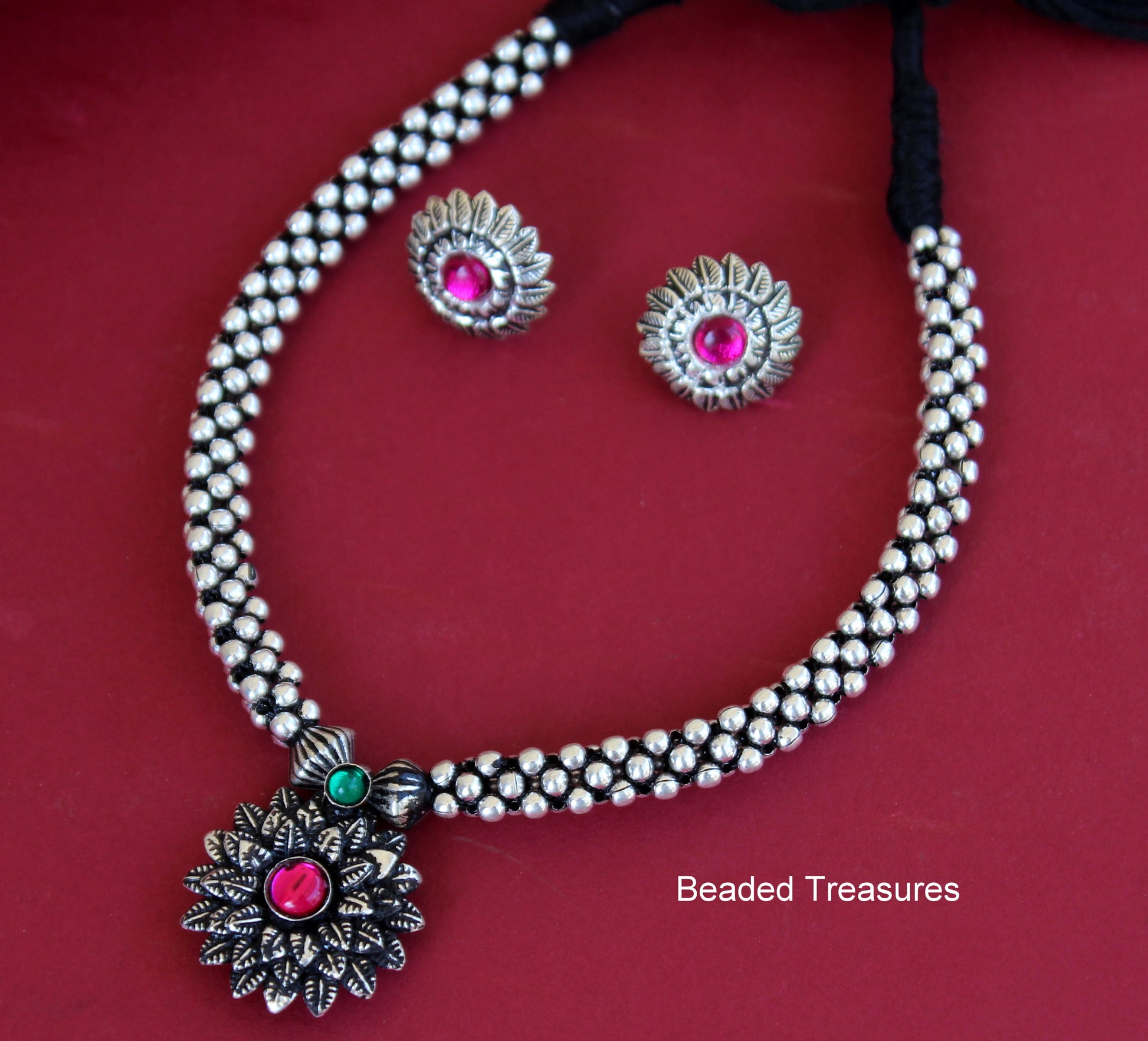 - Elegant Oxidised Silver Thushi Necklace Set, crafted by Beaded Treasures in Bengaluru.
