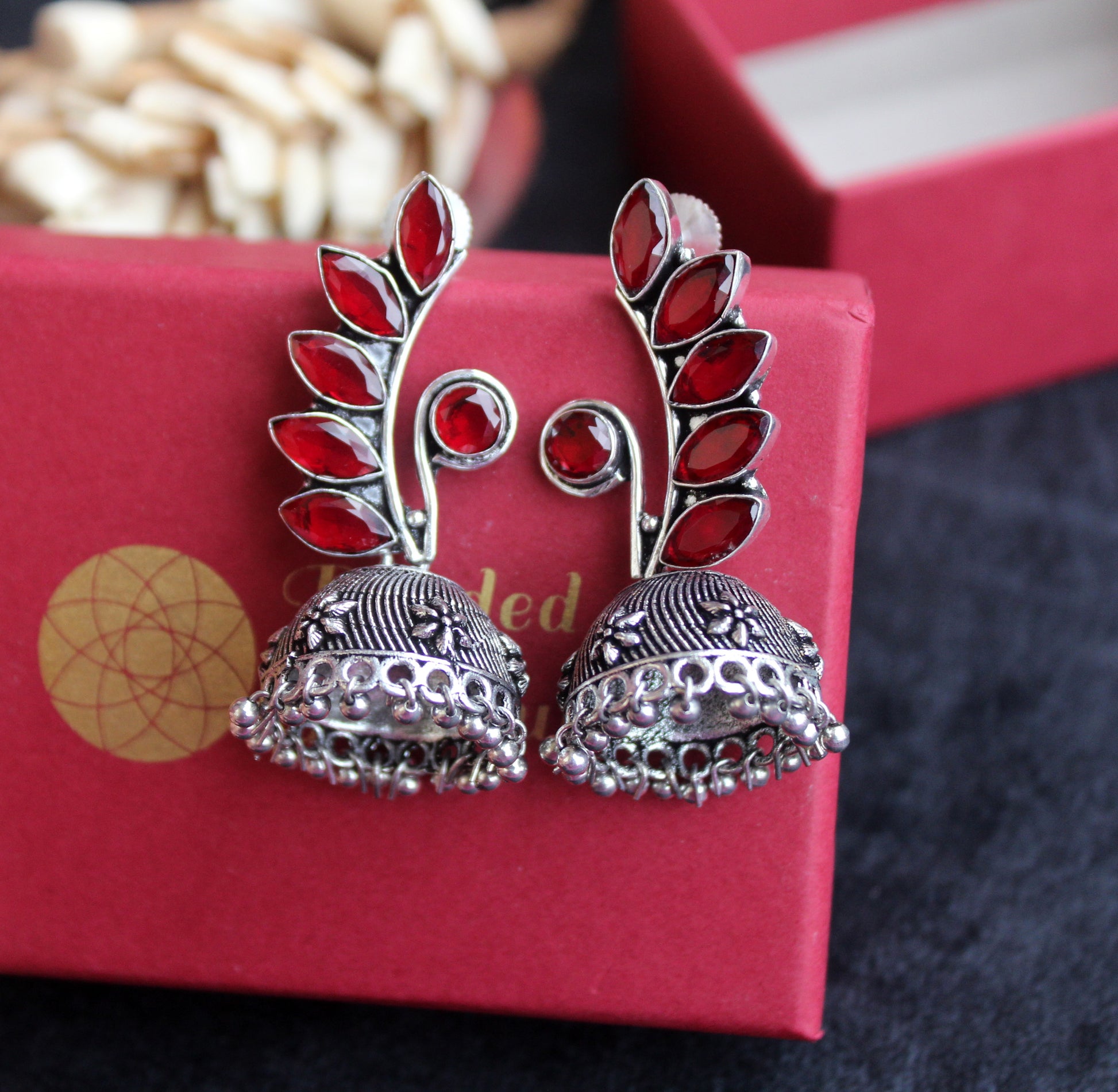 - Elegant Oxidized German Silver Jhumki Earrings with Red Stone Accents, handcrafted by Beaded Treasures in Bengaluru.
