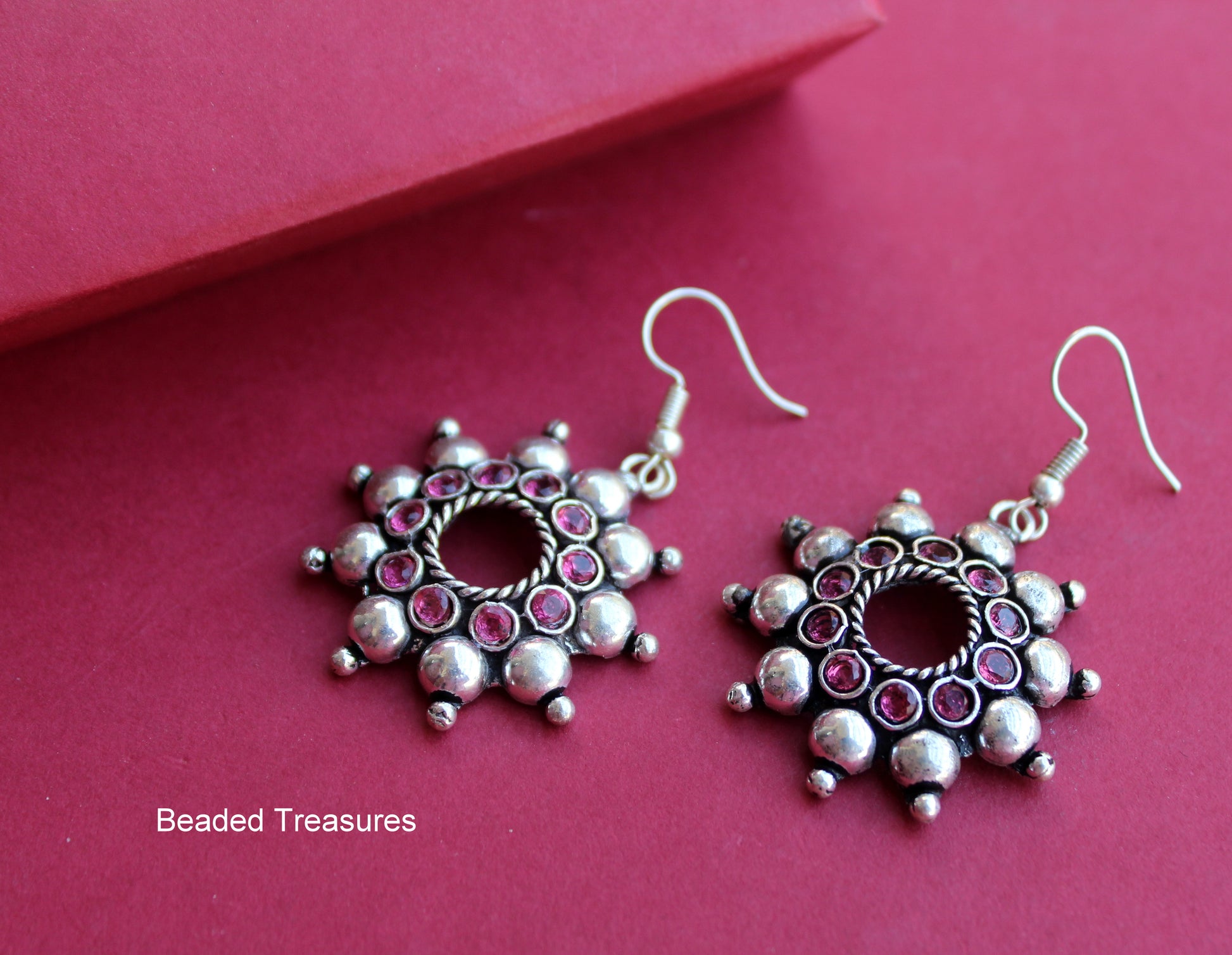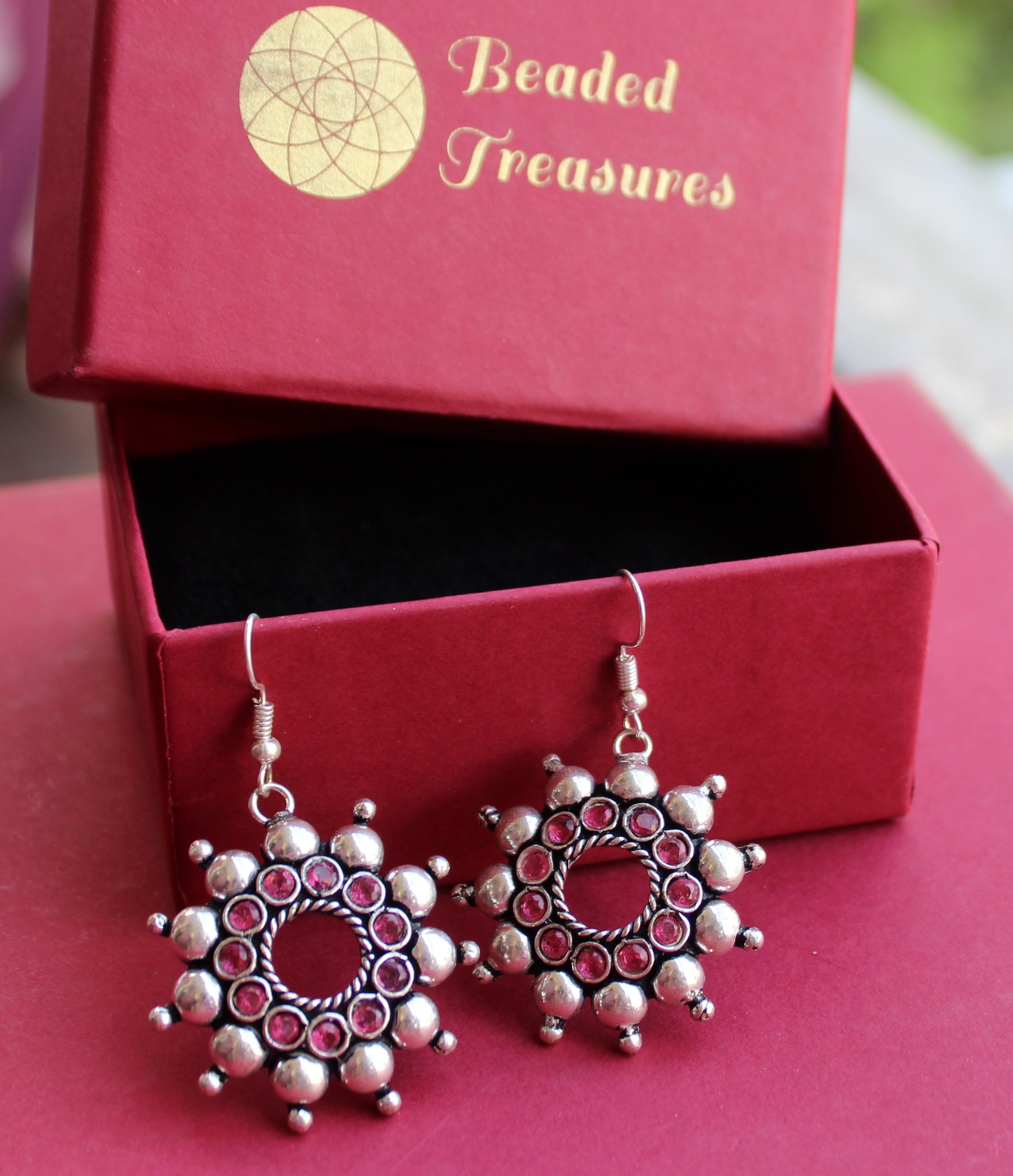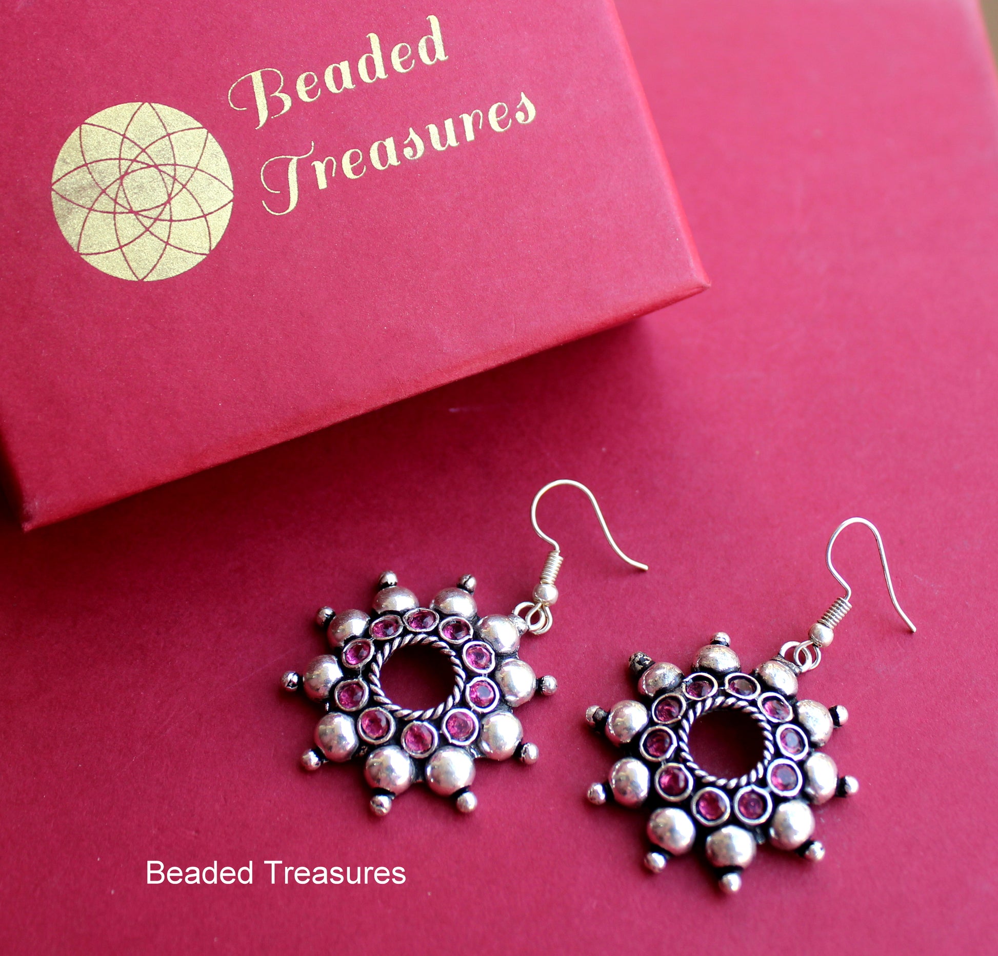 - Unique Oxidized Silver Dangler Earrings with Red Stones, handcrafted by Beaded Treasures in Bengaluru.