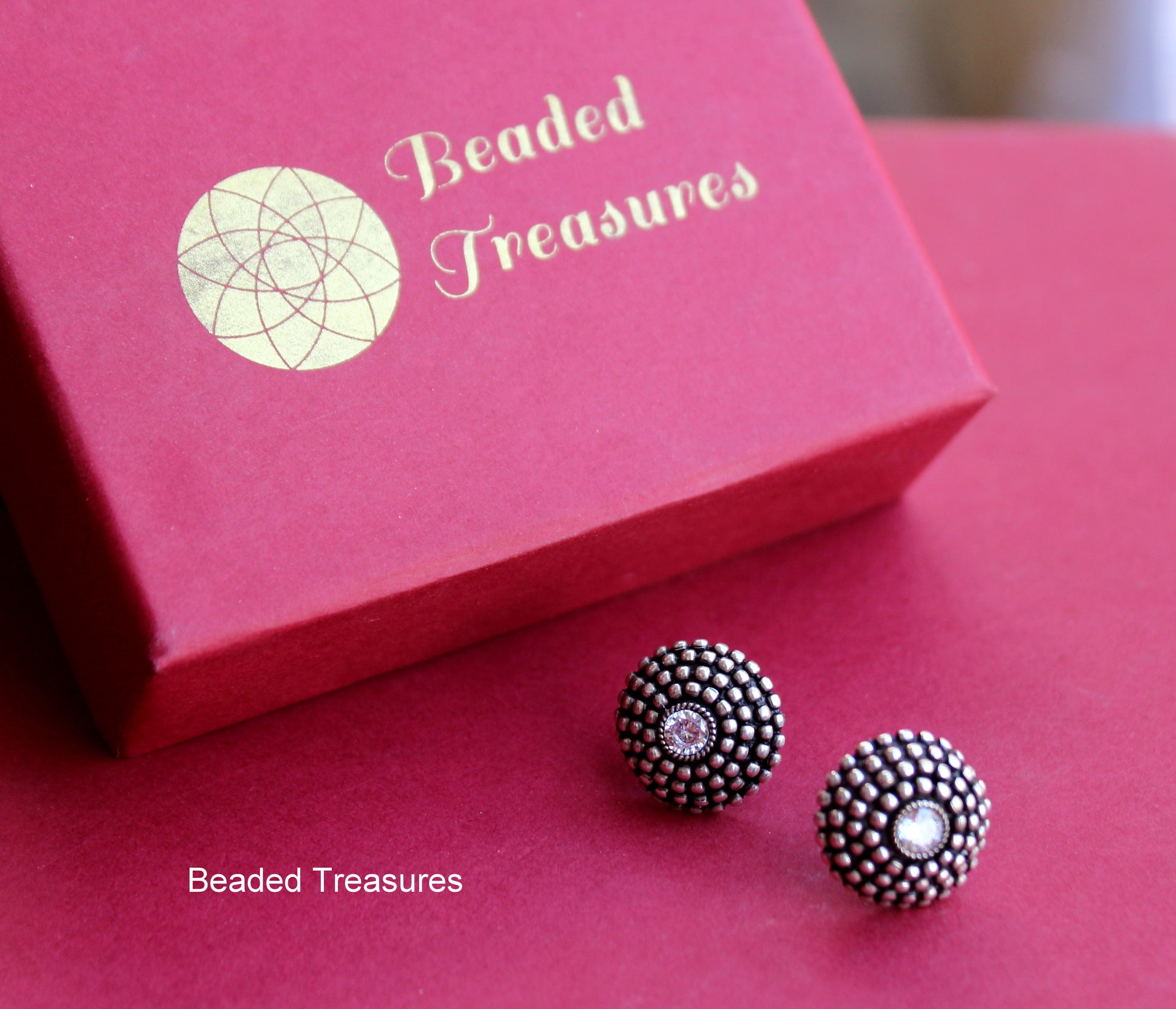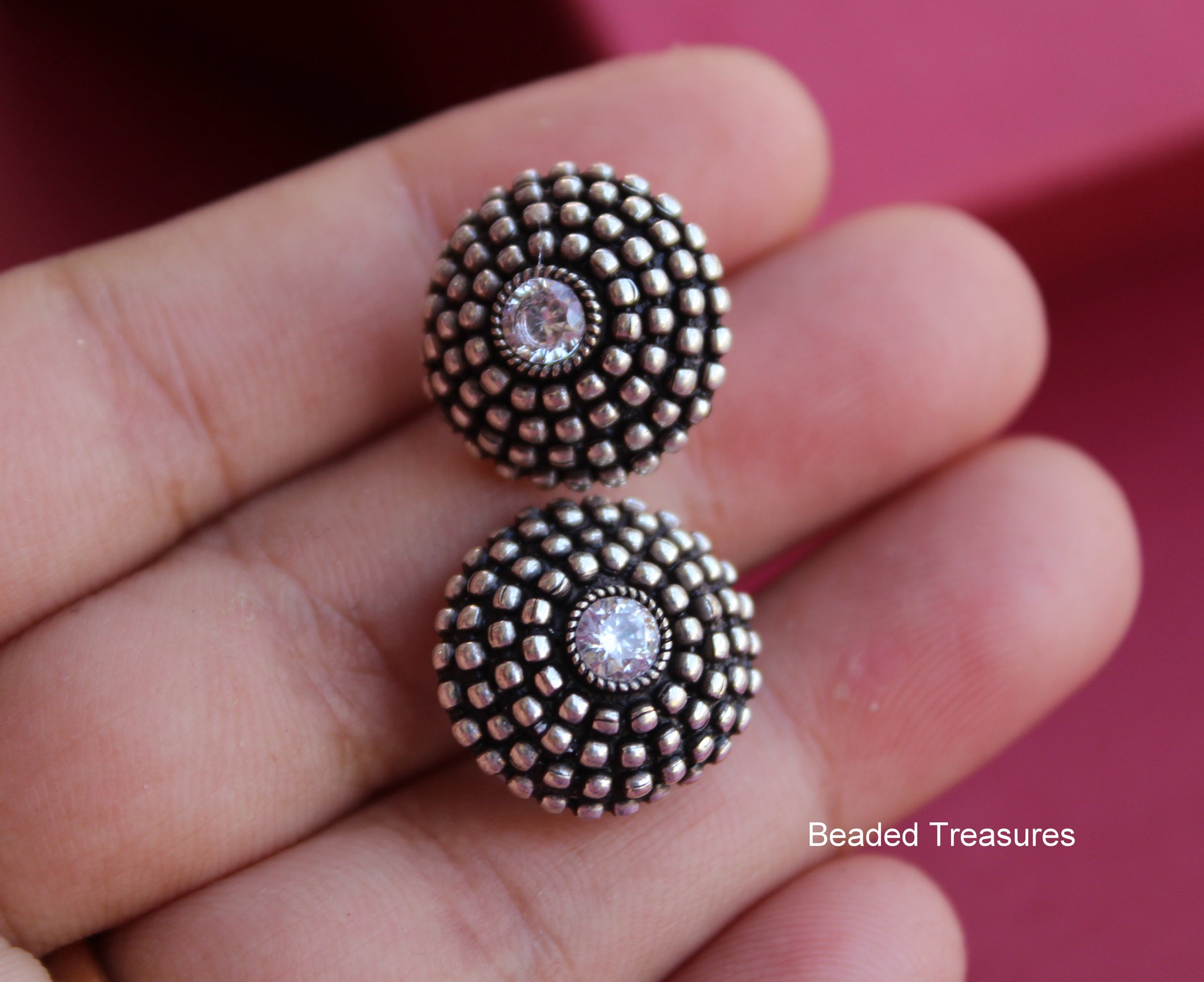 - Unique Oxidized Silver Domed Stud Earrings with Crystal Accents, handcrafted by Beaded Treasures in Bengaluru.