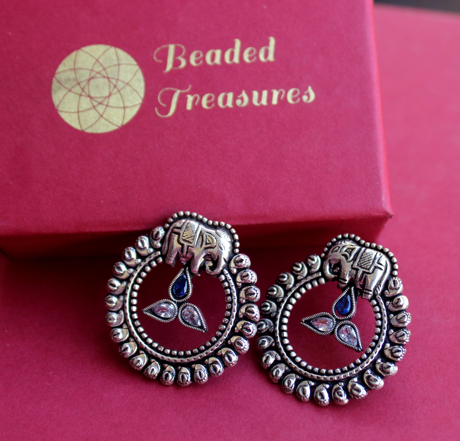 - Unique Oxidized Silver Elephant Stud Earrings with Stone Accents, handcrafted by Beaded Treasures in Bengaluru.