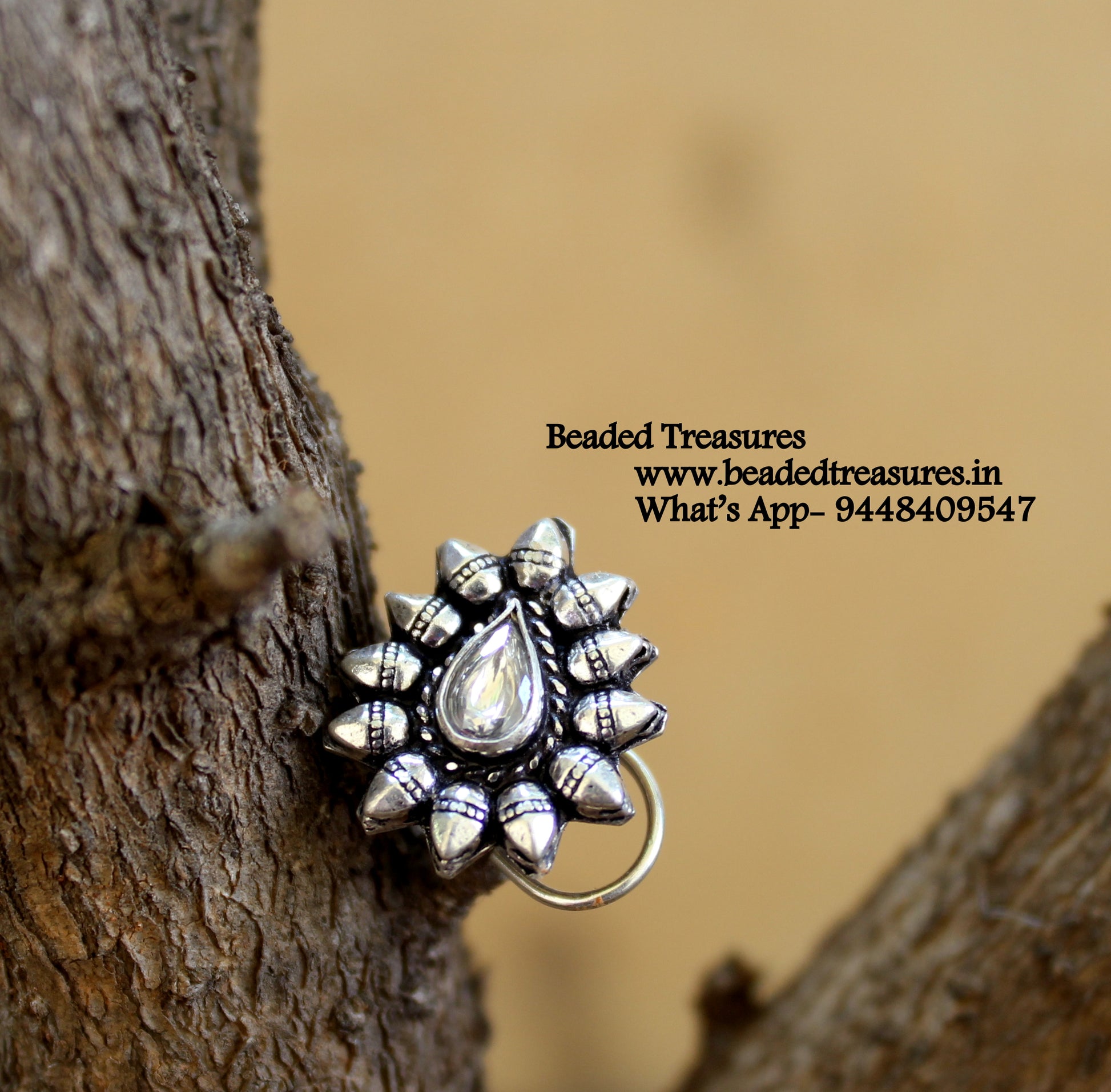 - Unique Oxidized Silver Flower Nose Stud with White Stone, handcrafted by Beaded Treasures in Bengaluru.