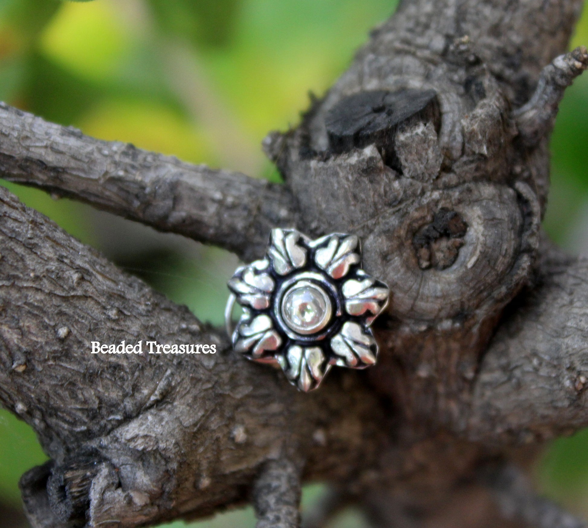 Oxidized Silver Flower Nose Stud with White Stone - Beaded Treasures