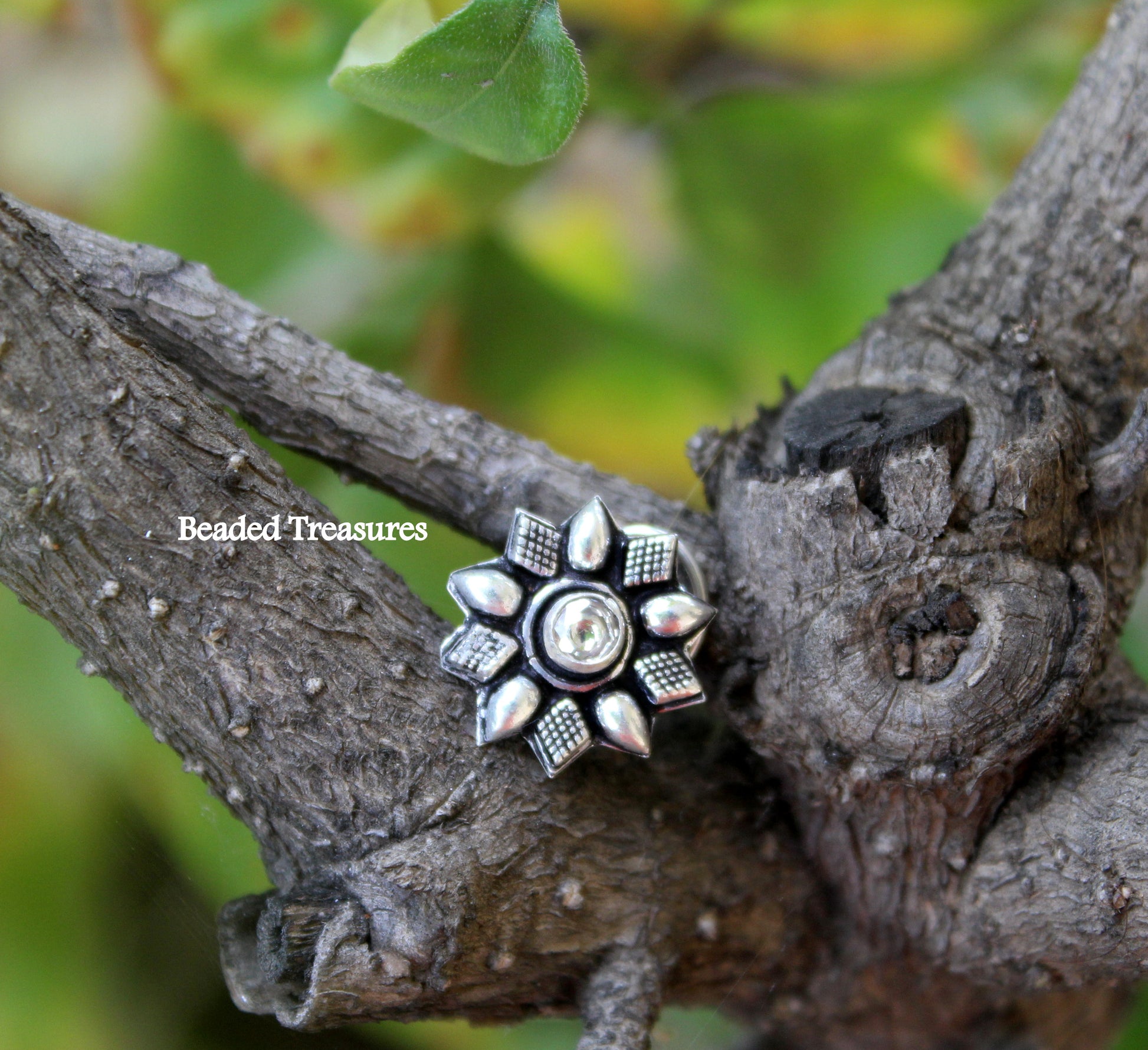 - Unique Oxidized Silver Flower Nose Stud with White Stone, handcrafted by Beaded Treasures in Bengaluru.