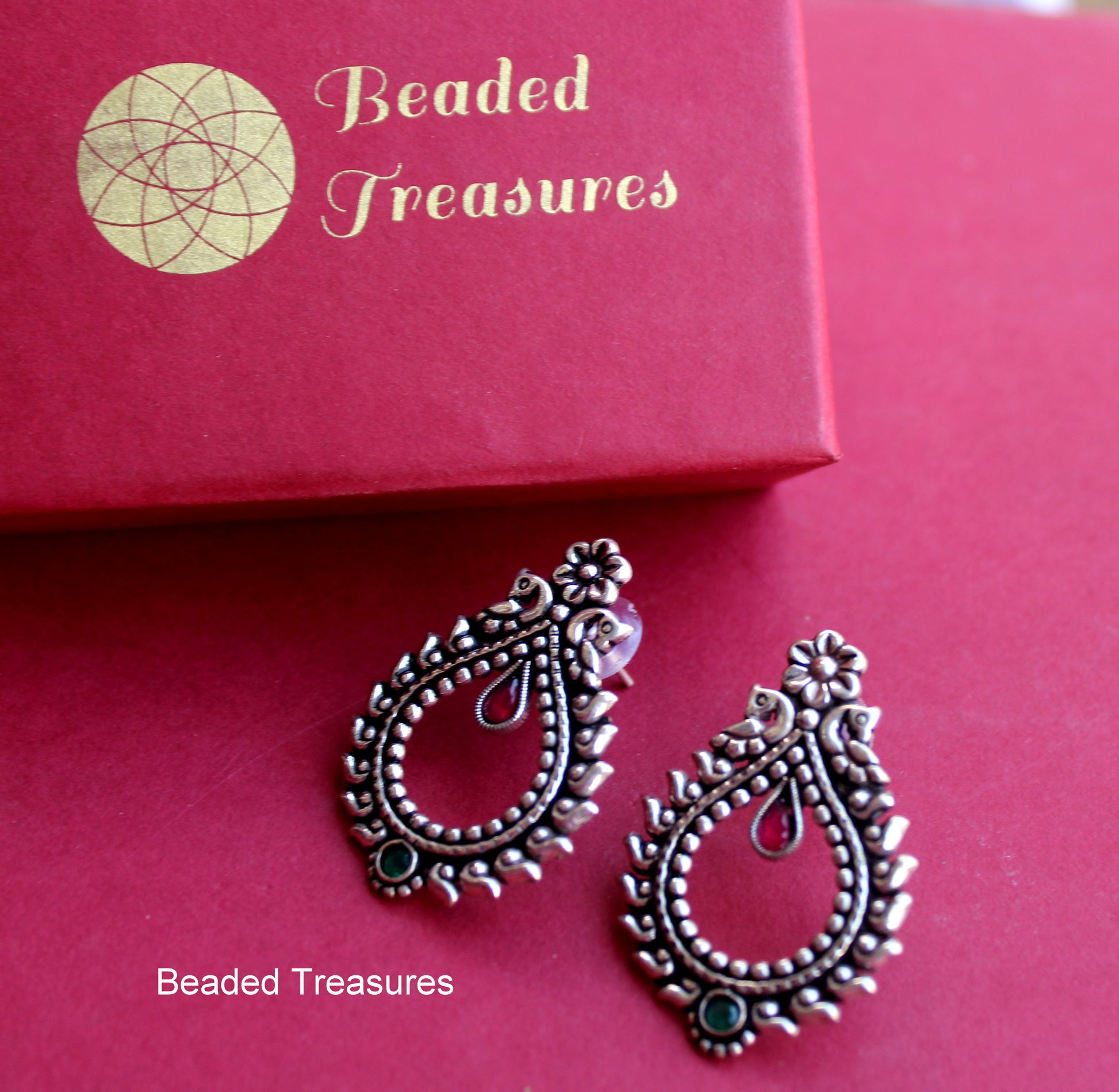 - Elegant Oxidized Silver Jhumka Stud Earrings, handcrafted by Beaded Treasures in Bengaluru.