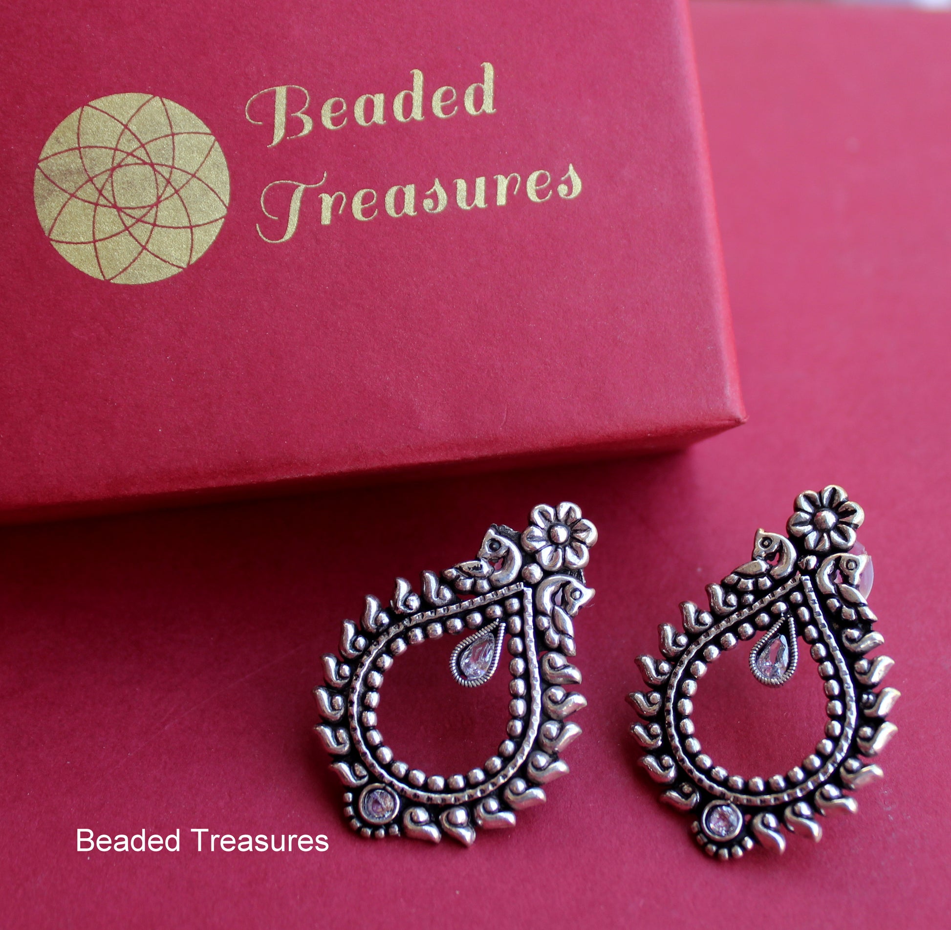 - Elegant Oxidized Silver Jhumka Stud Earrings with Stone Accents, handcrafted by Beaded Treasures in Bengaluru.