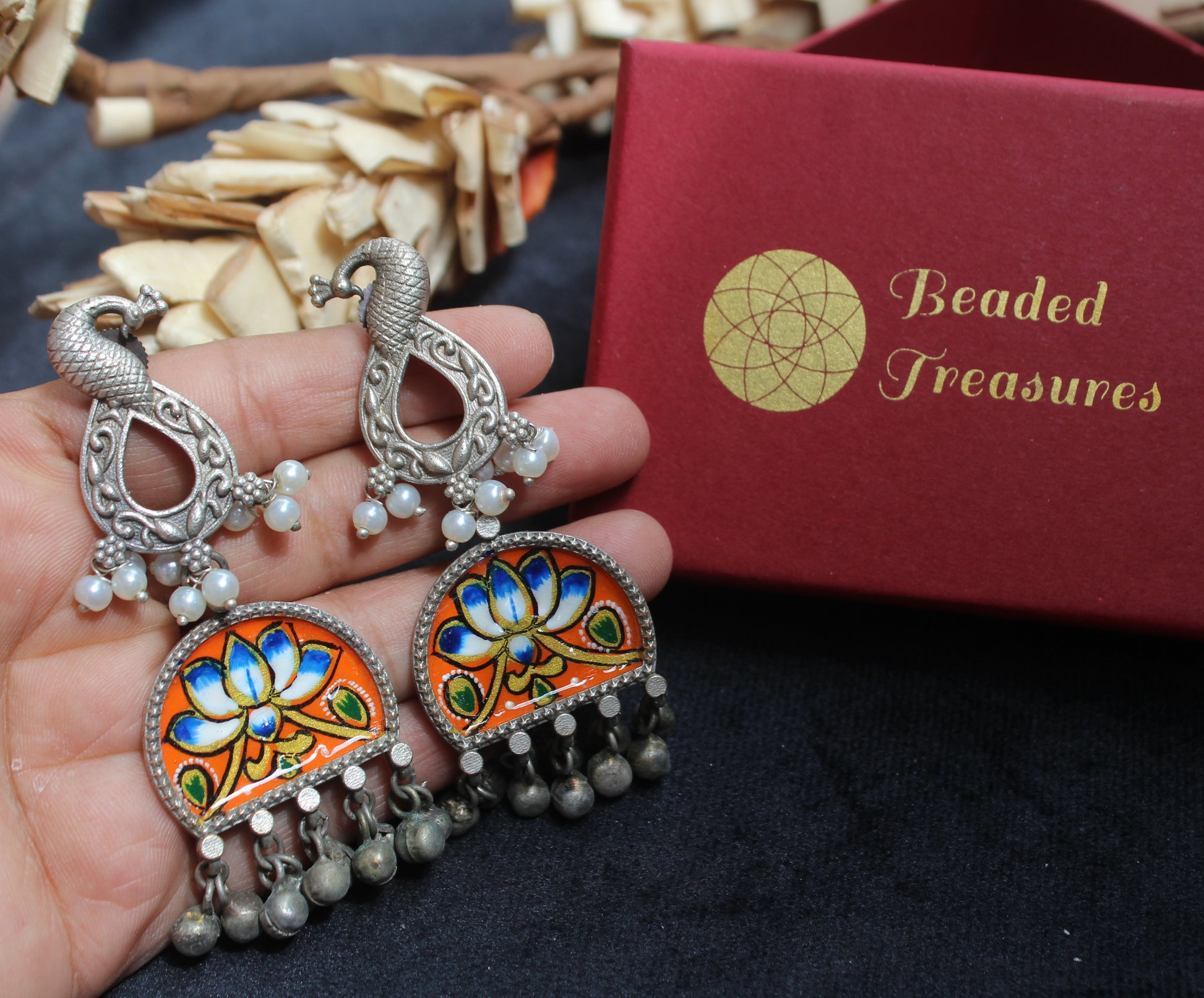 - Unique Oxidized Silver Peacock Earrings with Lotus Meenakari, handcrafted by Beaded Treasures in Bengaluru.