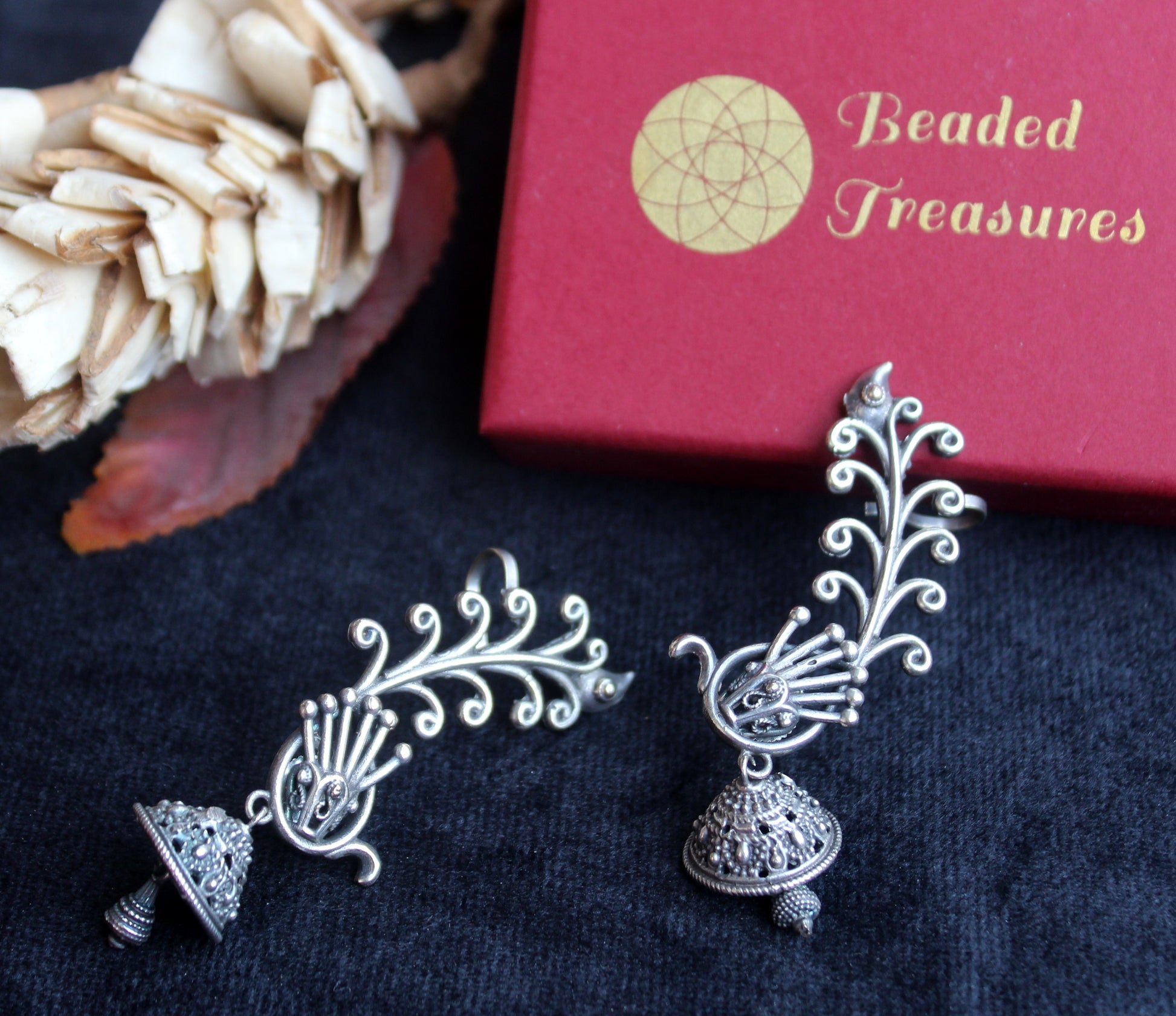 - Elegant Oxidized Silver Peacock Jhumki Earrings, also known as Mor Bugadi Earrings, handcrafted by Beaded Treasures in Bengaluru.