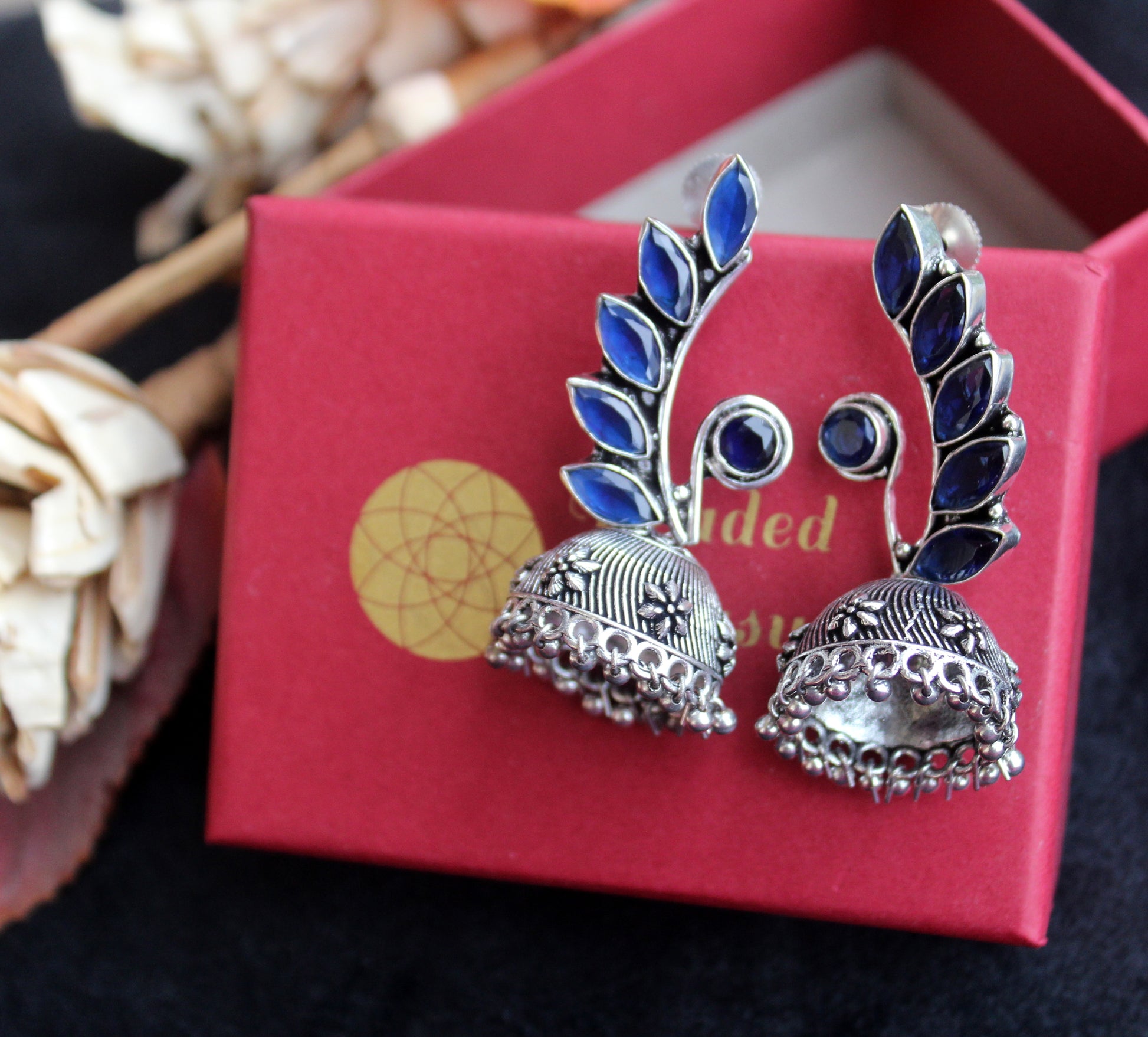 Oxidized Silver Peacock Jhumki Earrings with Blue Stones - Beaded Treasures
