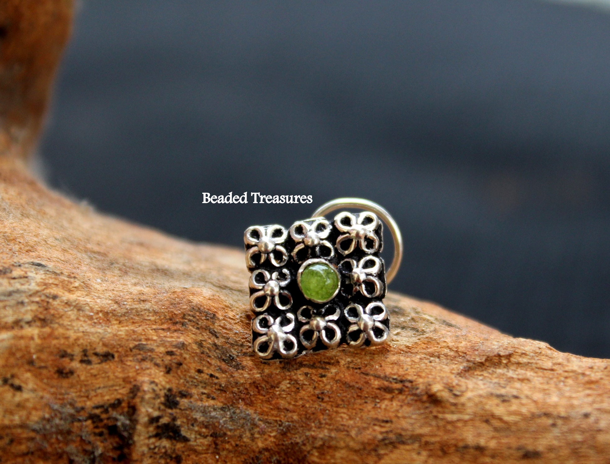 Oxidized Silver Square Nose Stud with Green Stone - Beaded Treasures