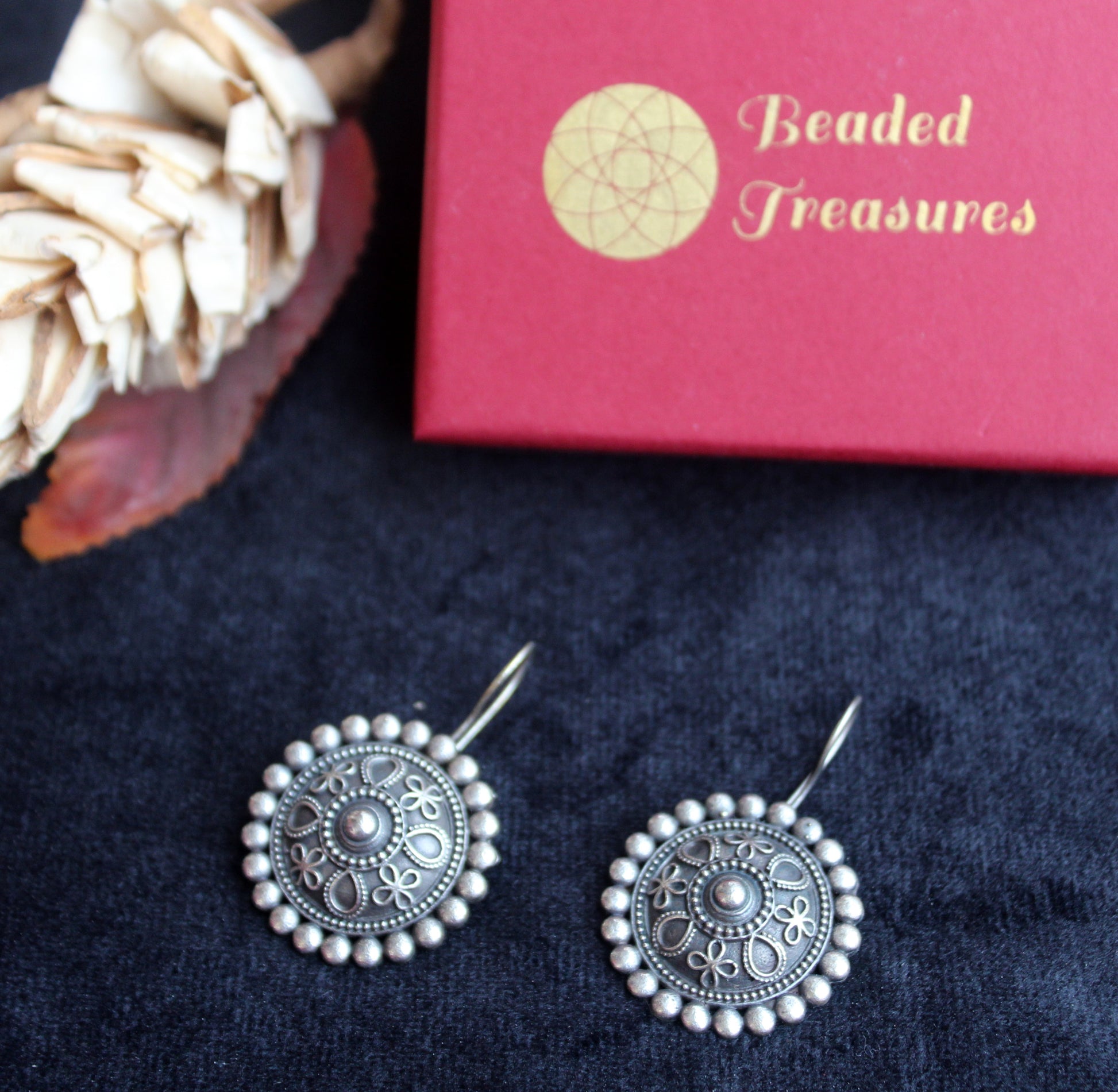 - Features a circular design with intricate detailing, including floral and stardust-like patterns, in oxidized silver.