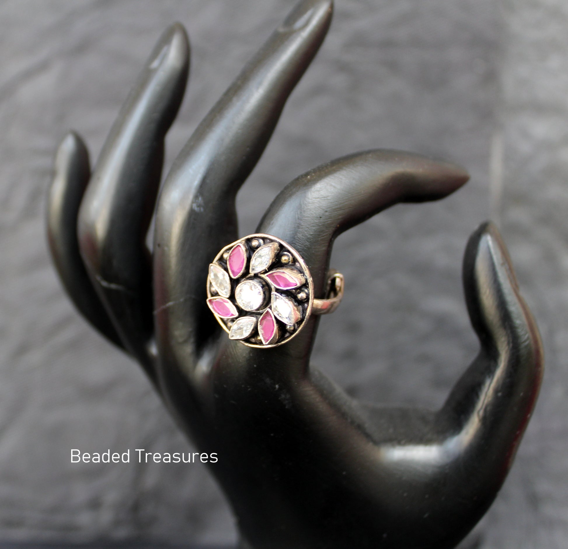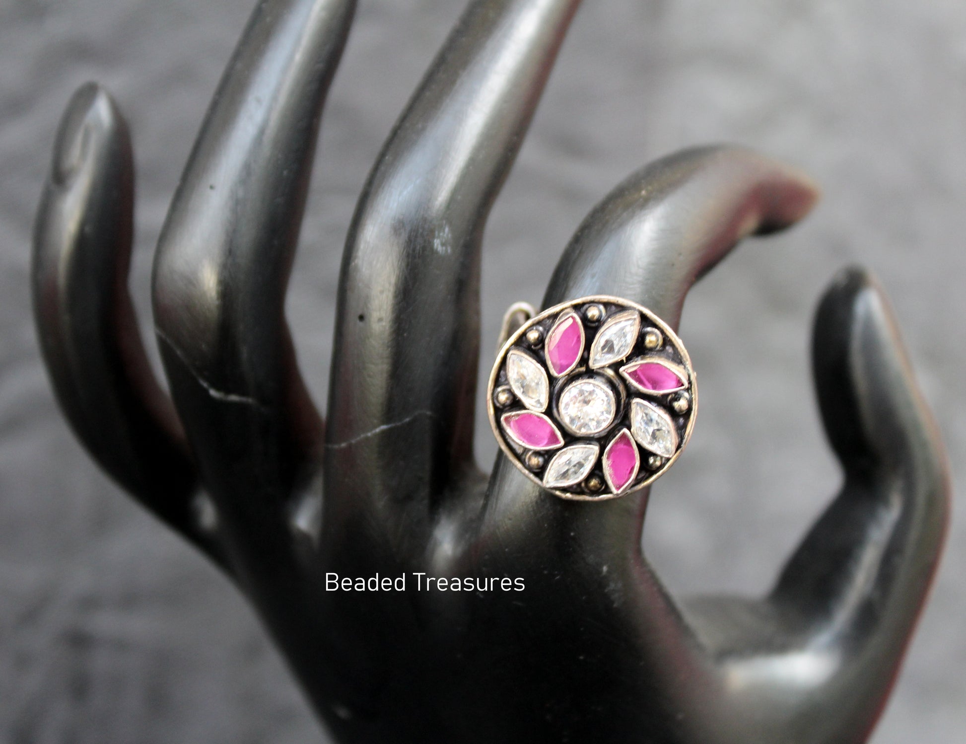 - Unique Oxidized Silver Style Adjustable Finger Ring featuring vibrant pink and sparkling white stones, handcrafted by Beaded Treasures in Bengaluru.