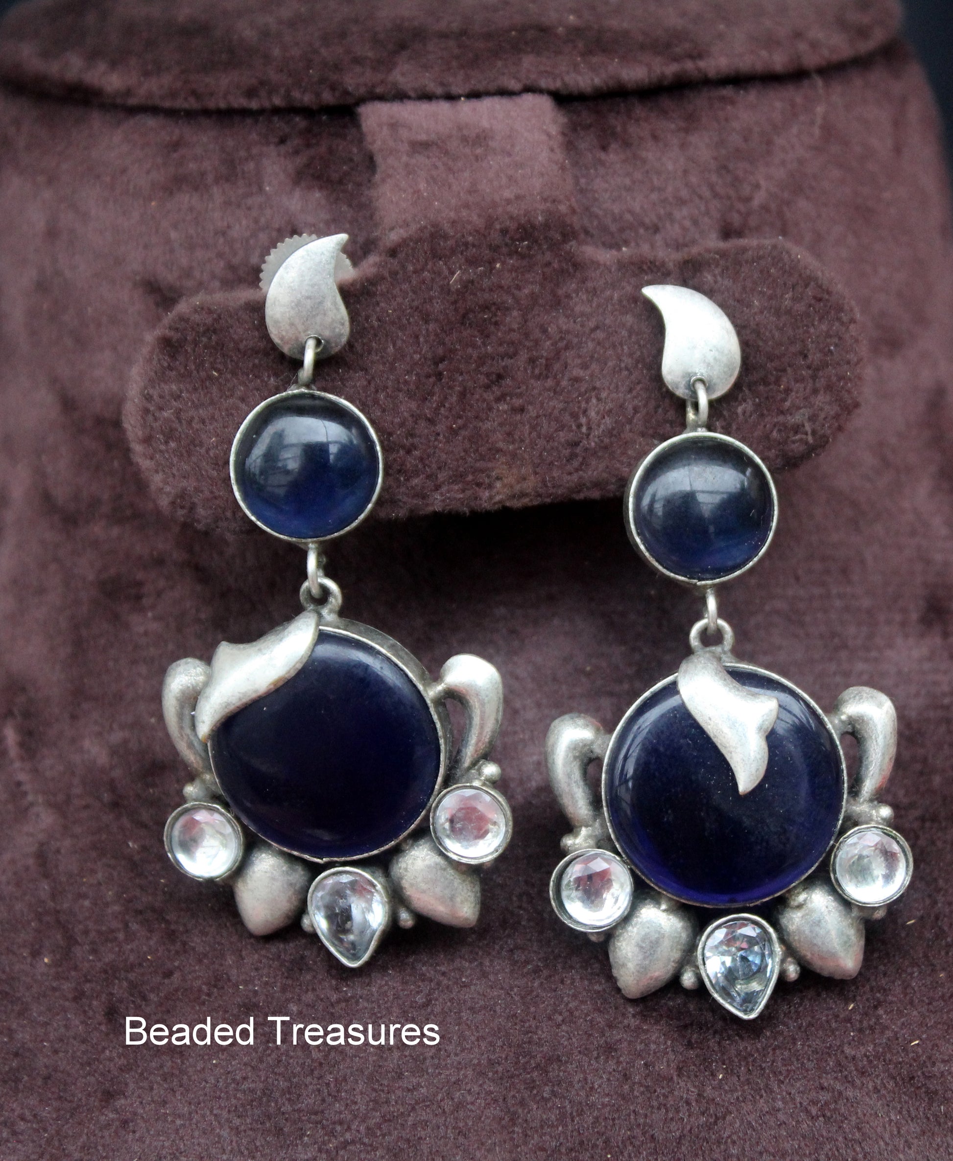 - Unique Oxidized Silver Style Earrings featuring deep blue and sparkling white stones, handcrafted by Beaded Treasures in Bengaluru.