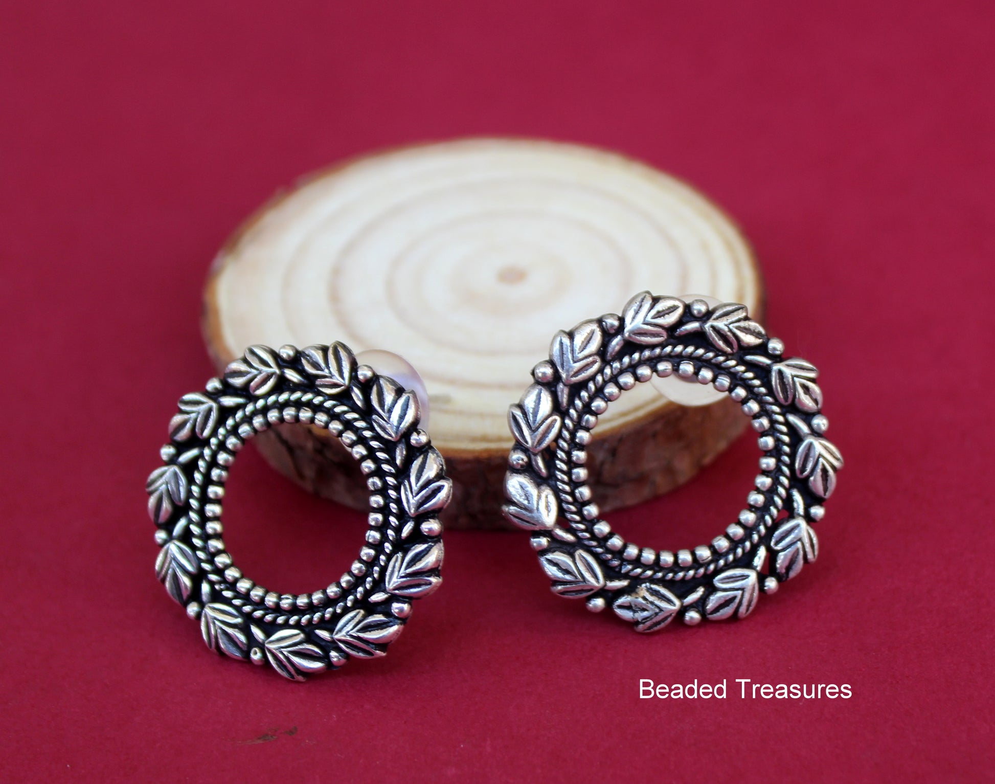 - Unique Oxidized Silver Style Stud Earrings with a beautiful floral circle design, handcrafted by Beaded Treasures in Bengaluru.