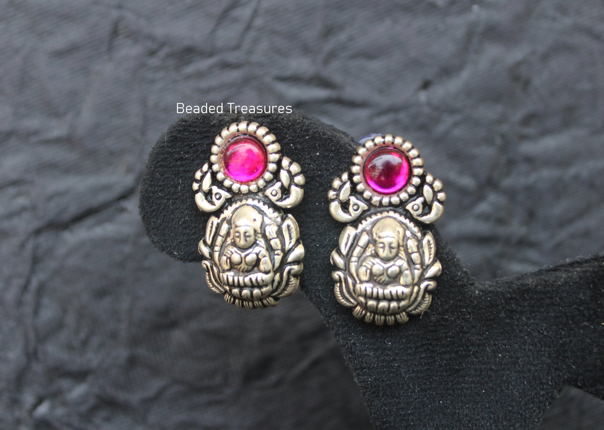 - Elegant Oxidized Silver Style Stud Earrings featuring the revered Goddess Lakshmi Devi and a vibrant pink stone, handcrafted by Beaded Treasures in Bengaluru.