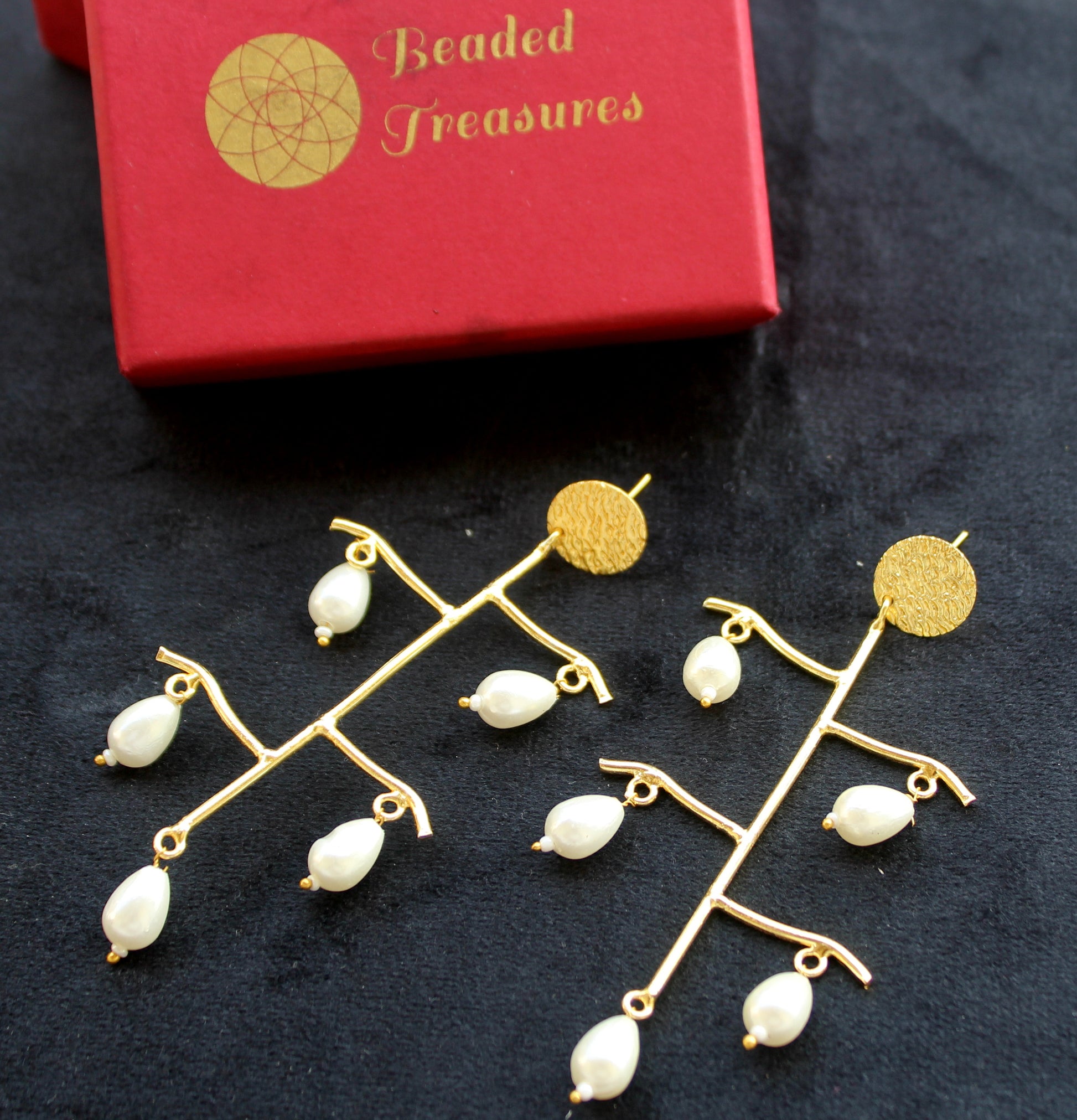 - Elegant Pearl Drop Long Brass Earrings, handcrafted by Beaded Treasures in Bengaluru.
