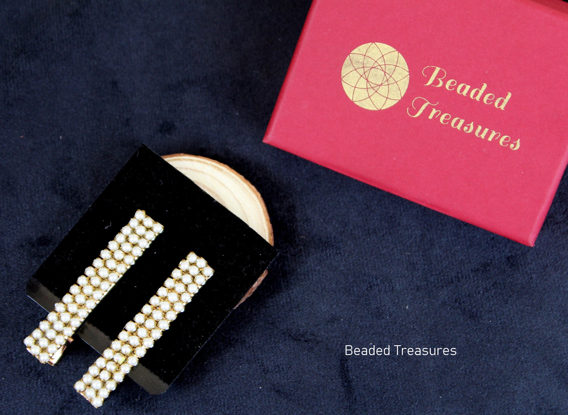 - Elegant Pearl Hair Clips, handcrafted by Beaded Treasures in Bengaluru.