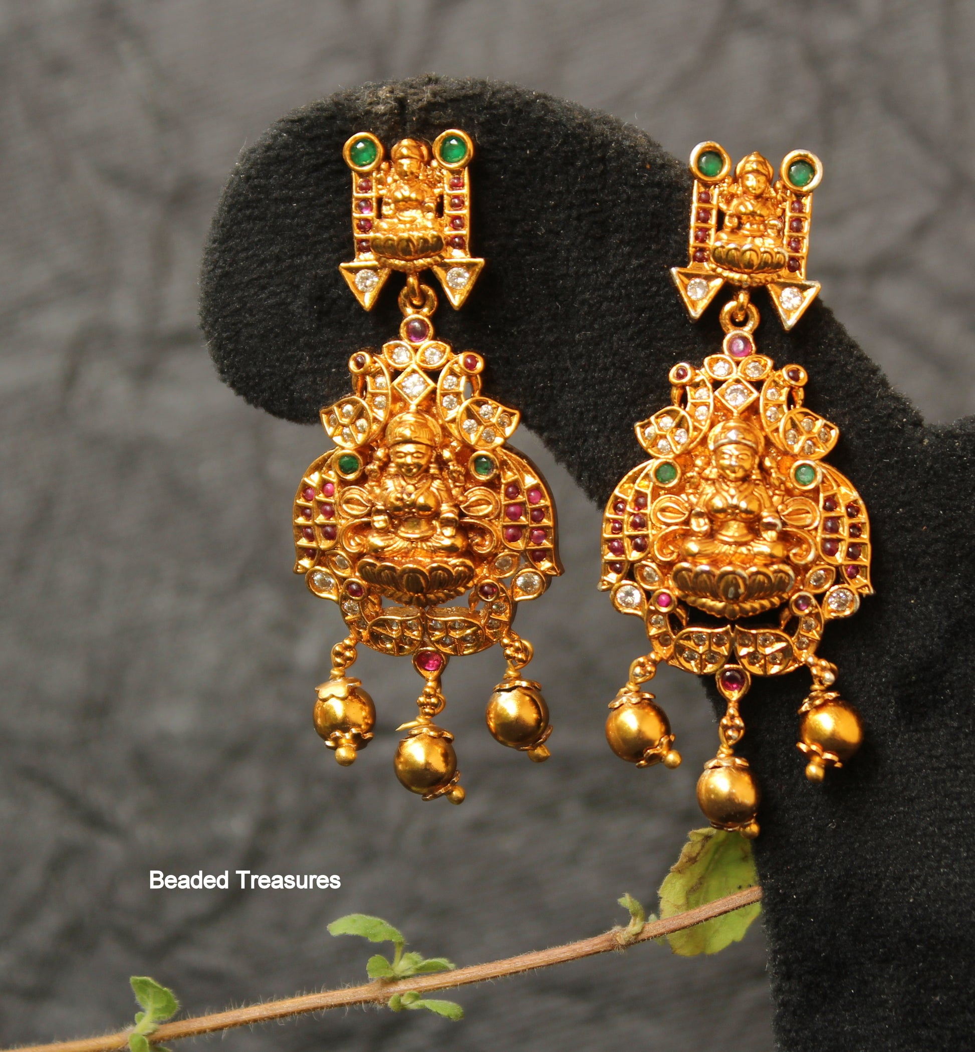 - Regal pair of dangling earrings featuring a beautiful matte gold finish and intricate depictions of Goddess Lakshmi Devi, adorned with vibrant Kemp (ruby-like), emerald-like, and sparkling white stones (likely CZ), handcrafted by Beaded Treasures in Bengaluru.
