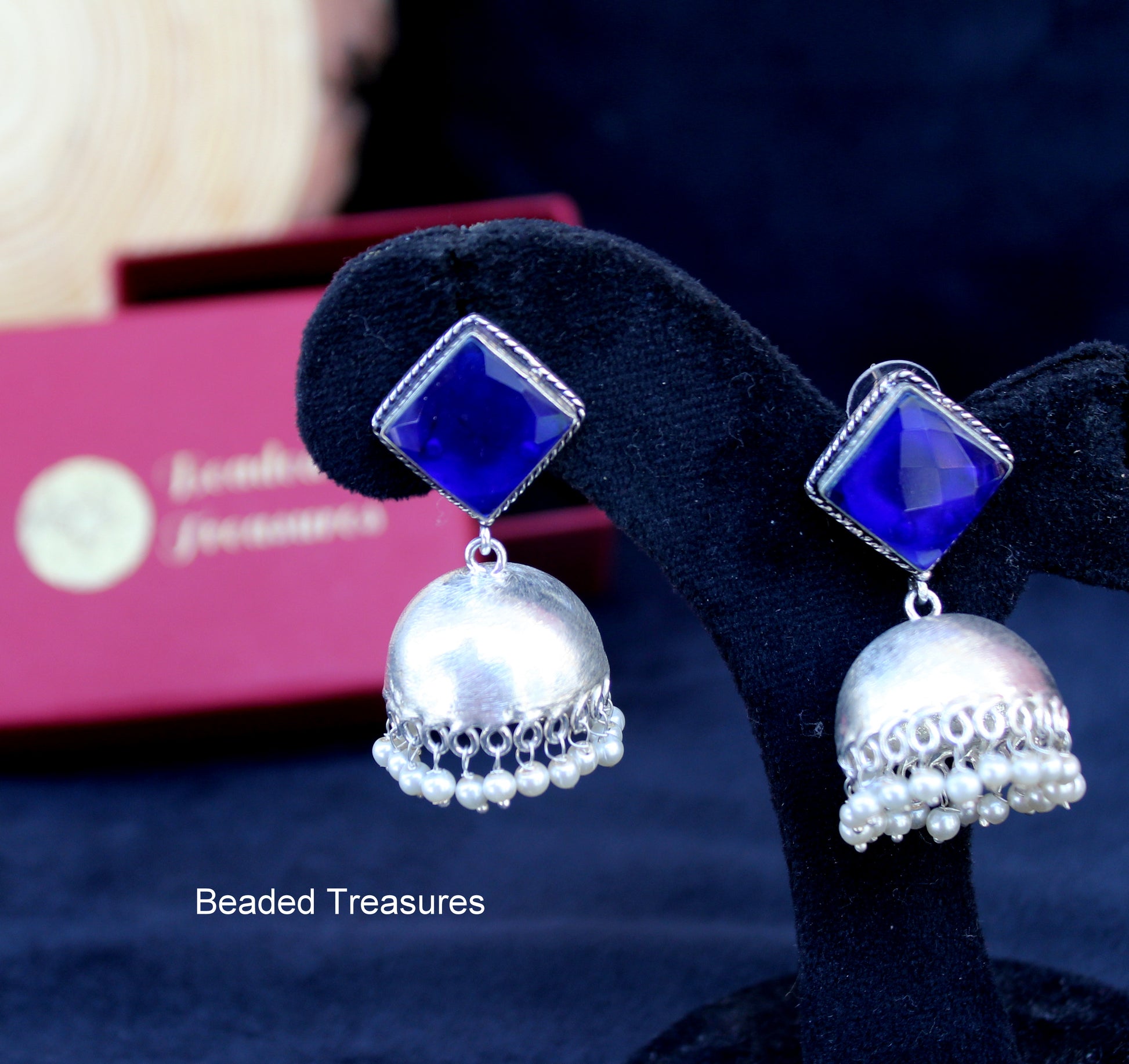 - Striking Silver-Plated Jhumka Earrings with Blue Stone and Pearl Accents, handcrafted by Beaded Treasures in Bengaluru.