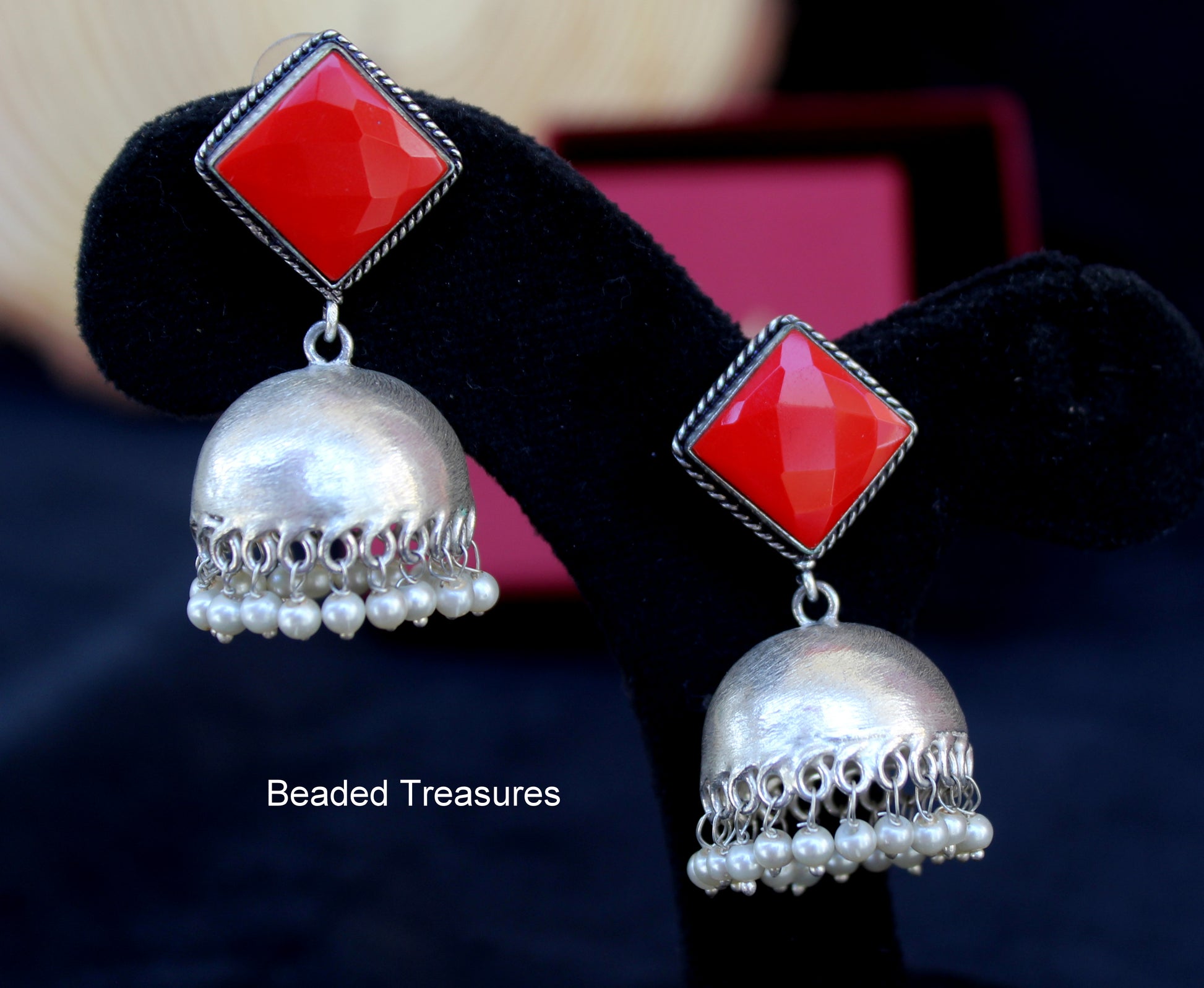 - Striking Silver-Plated Jhumka Earrings with Red Stone and Pearl Accents, handcrafted by Beaded Treasures in Bengaluru.