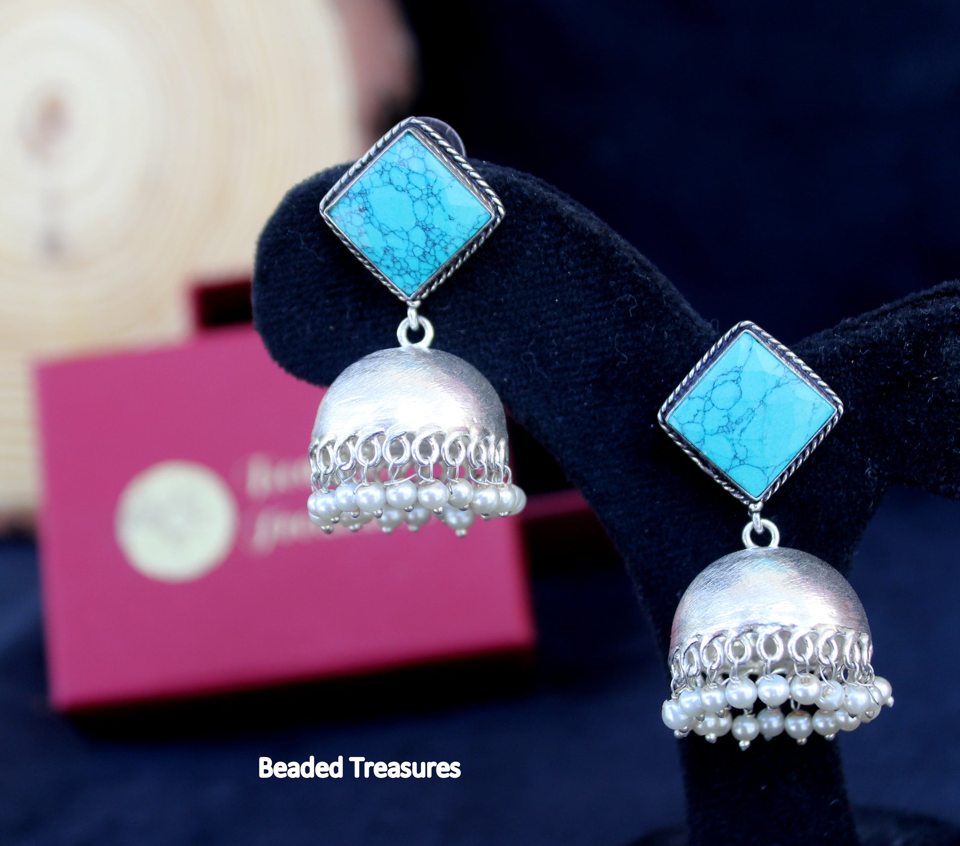 - Striking Silver-Plated Jhumka Earrings with Turquoise Stone and Pearl Accents, handcrafted by Beaded Treasures in Bengaluru.