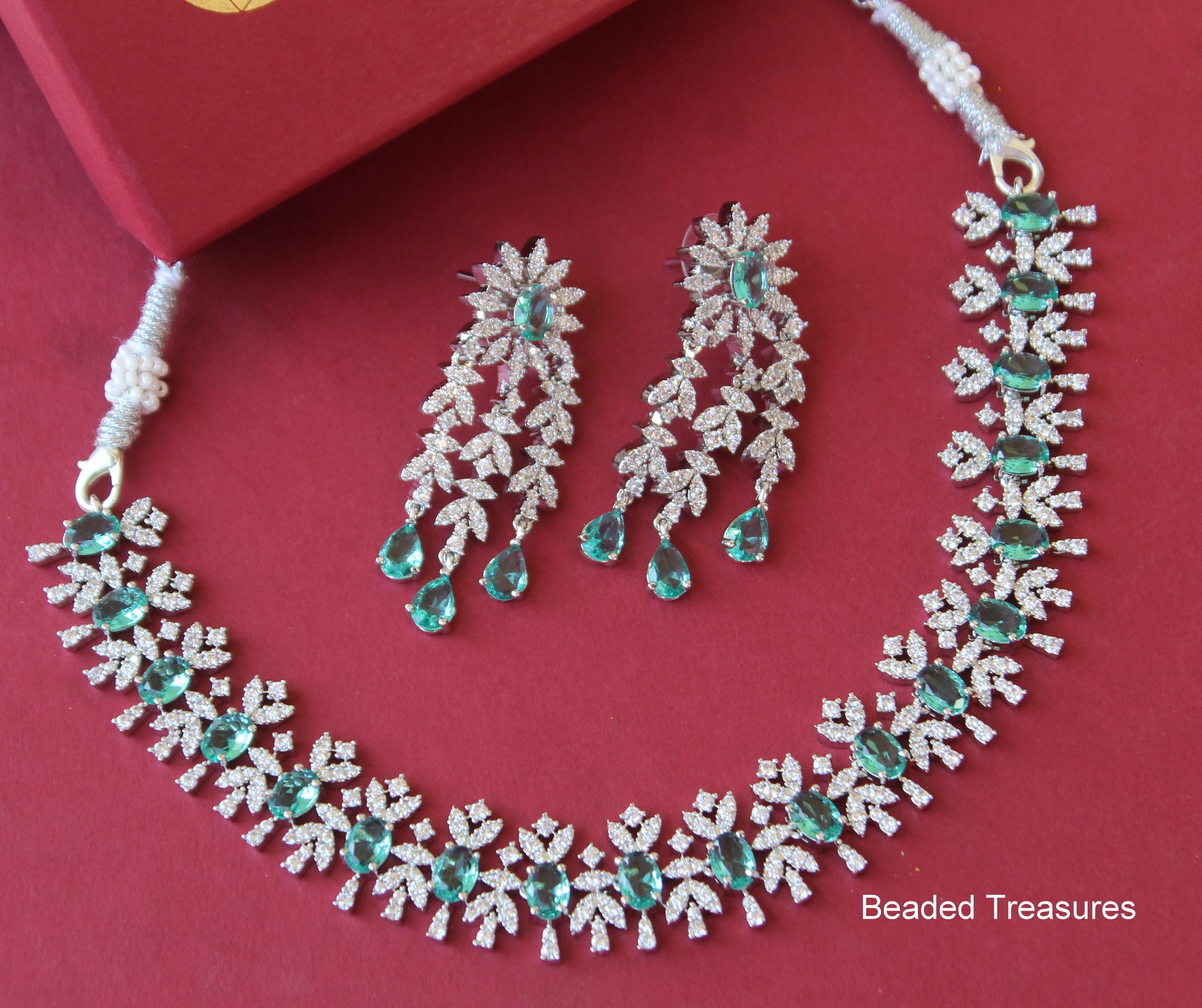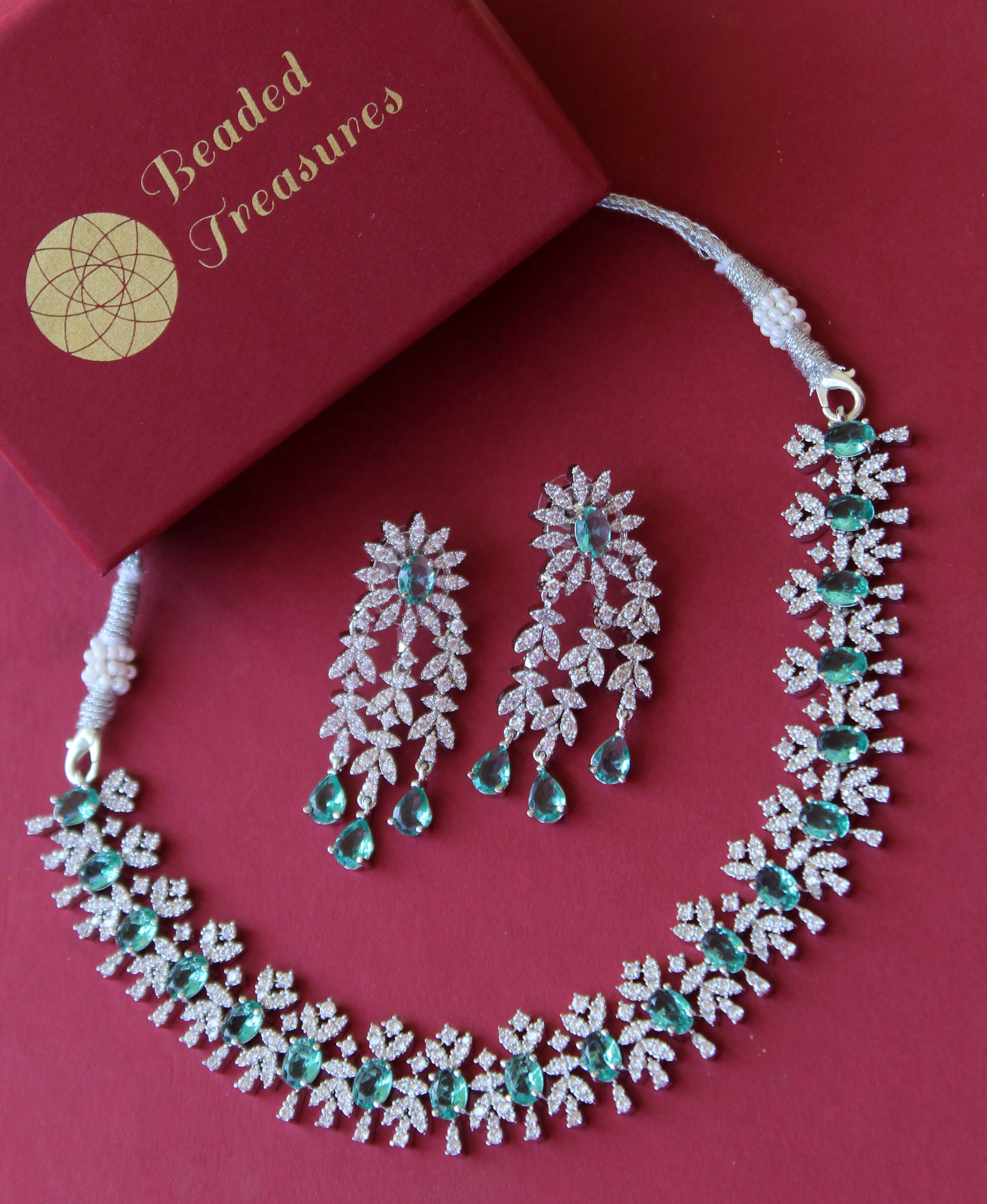 - Elegant Silver Tone CZ Classic Necklace and Earring Set with Rhodium Plating and Green Stone Accents, handcrafted by Beaded Treasures in Bengaluru.
