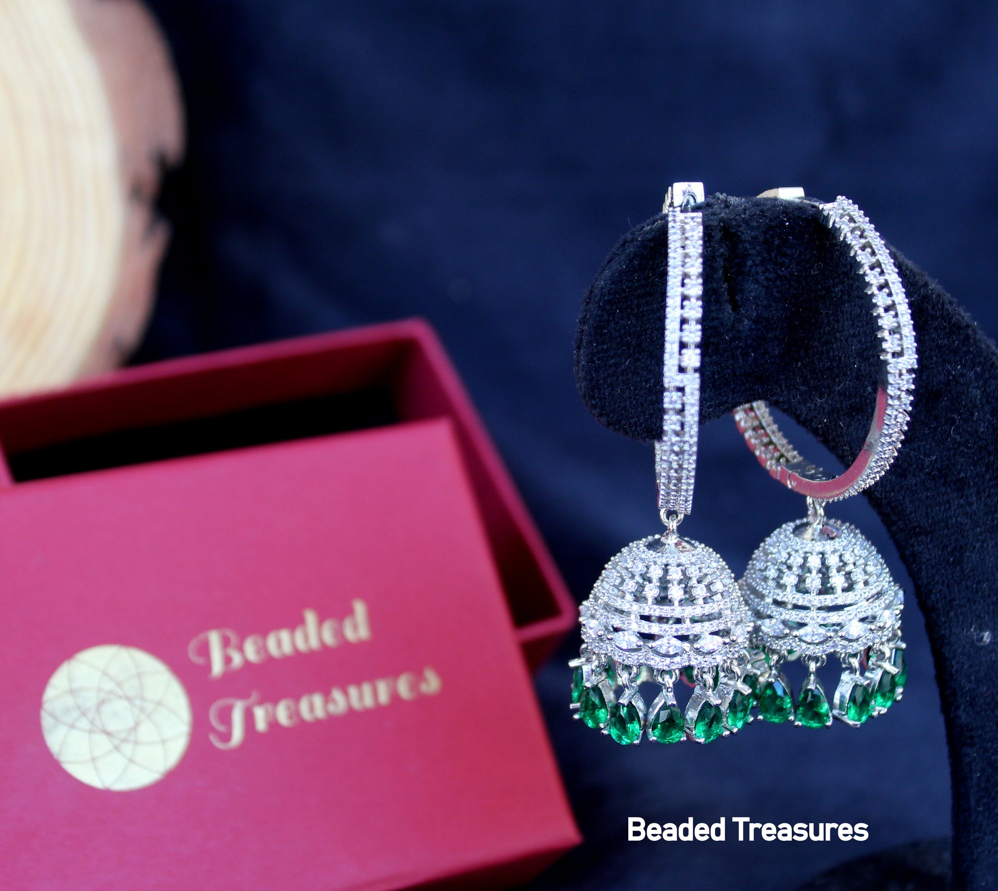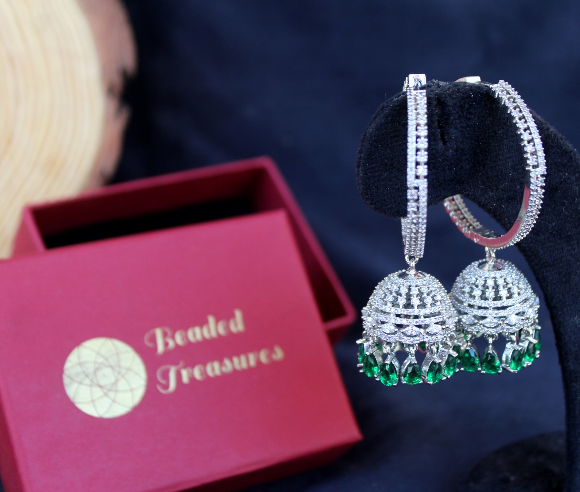 - Glamorous Silver-Toned CZ Hoop Jhumka Earrings with Green Stone Drops, handcrafted by Beaded Treasures in Bengaluru.