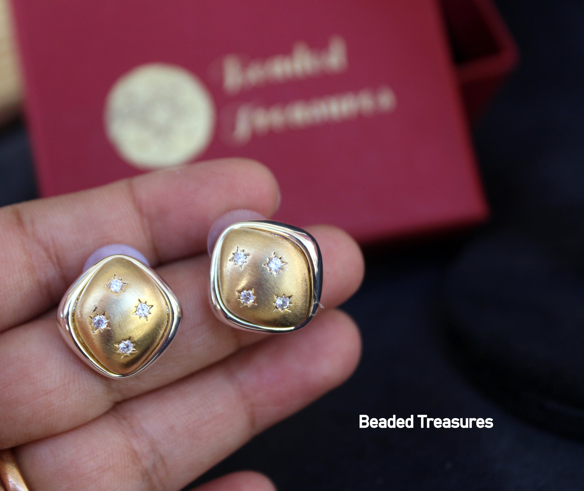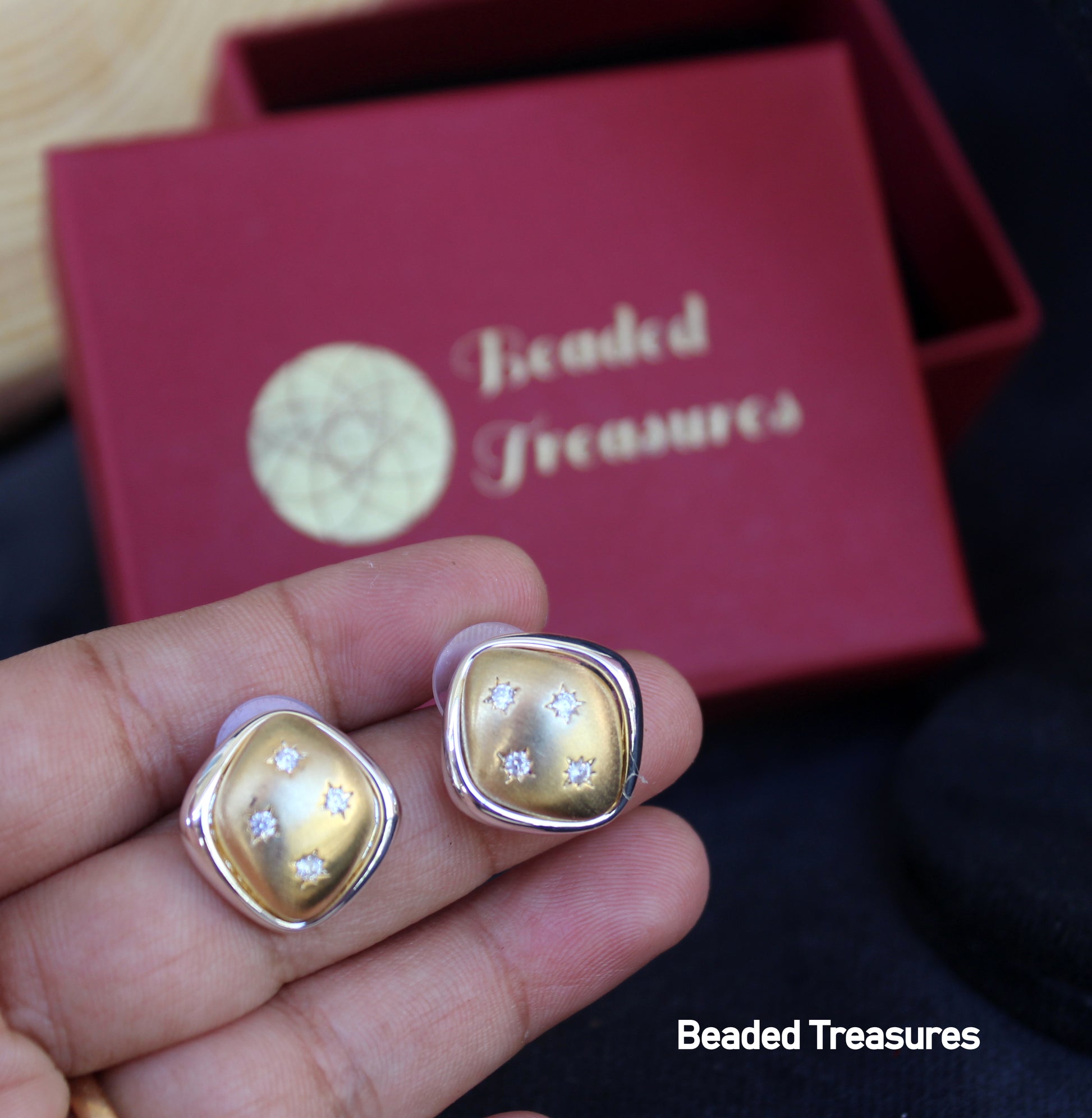 - Elegant Square Mother of Pearl Stud Earrings with CZ Accents, handcrafted by Beaded Treasures in Bengaluru.
