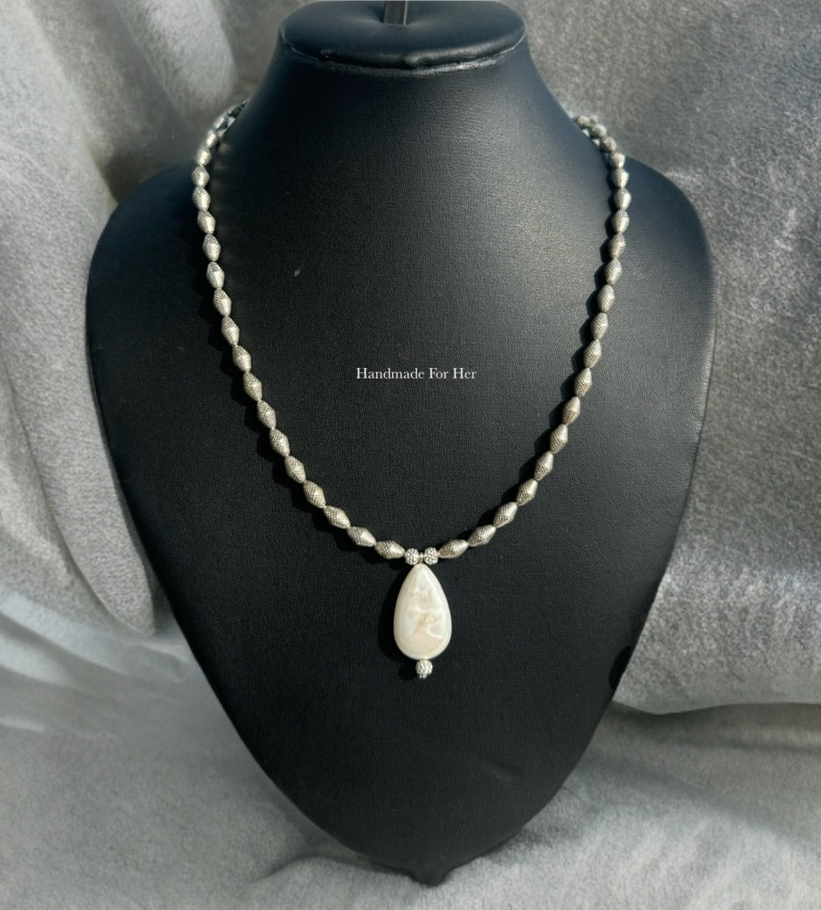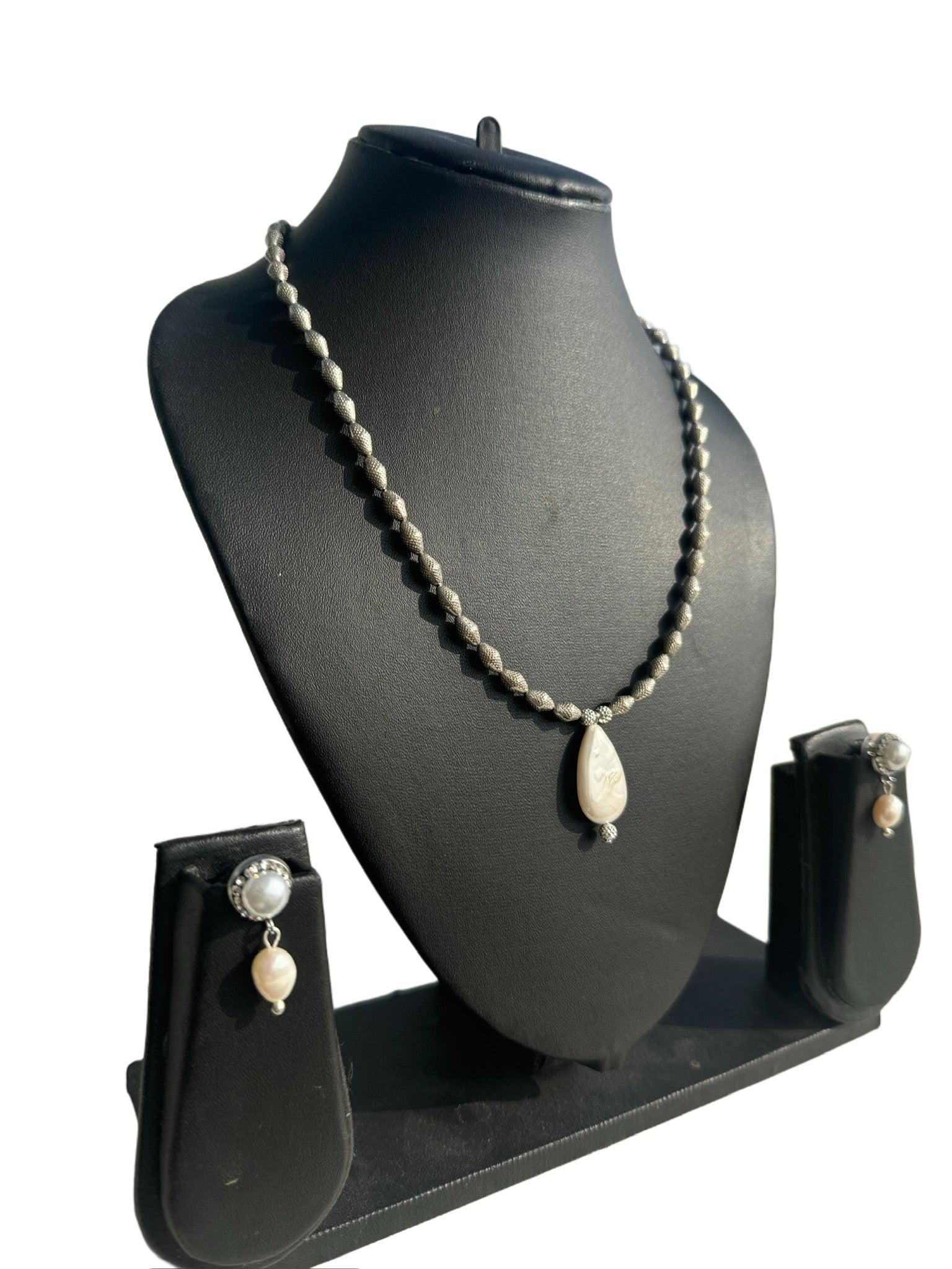 - Elegant Necklace Set featuring unique baroque pearls set in a beautiful sterling silver design, including a beaded necklace with a statement pendant and matching stud earrings, handcrafted by Beaded Treasures in Bengaluru.