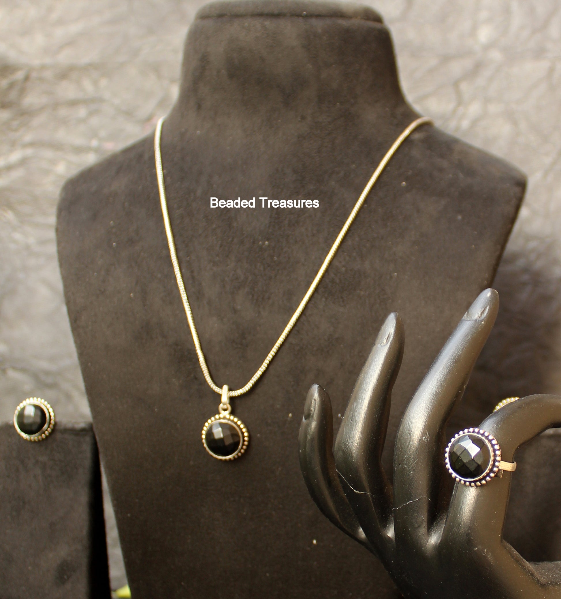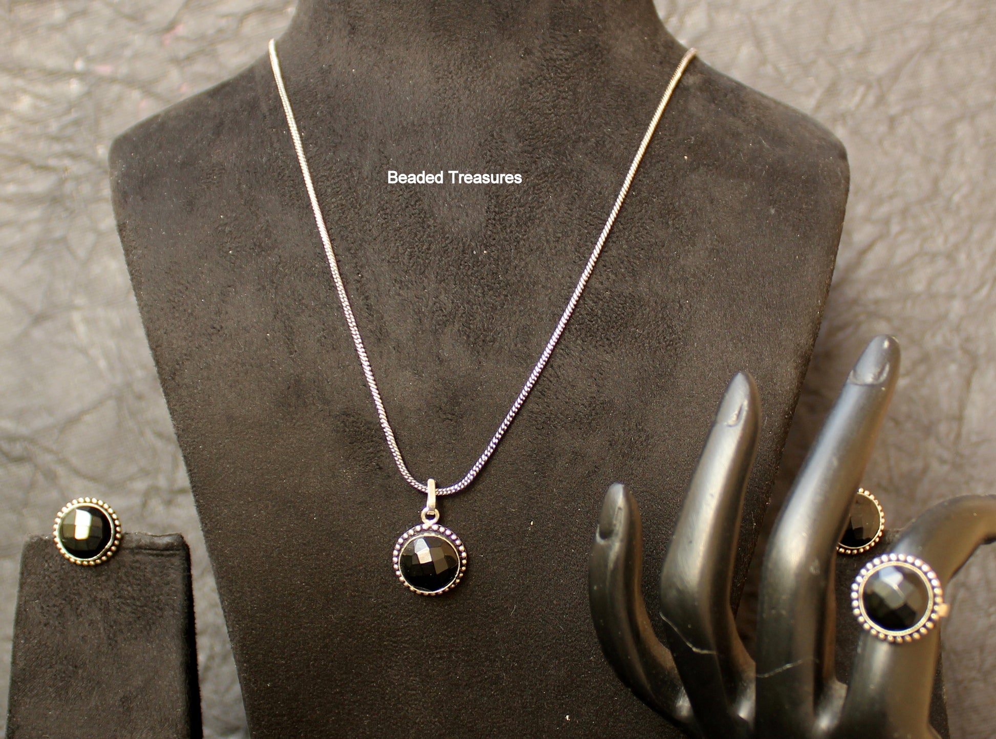 - Elegant and classic Necklace Set featuring polished black agate stones set in a beautiful sterling silver frame with intricate detailing, including a pendant necklace, stud earrings, and an adjustable ring, handcrafted by Beaded Treasures in Bengaluru.