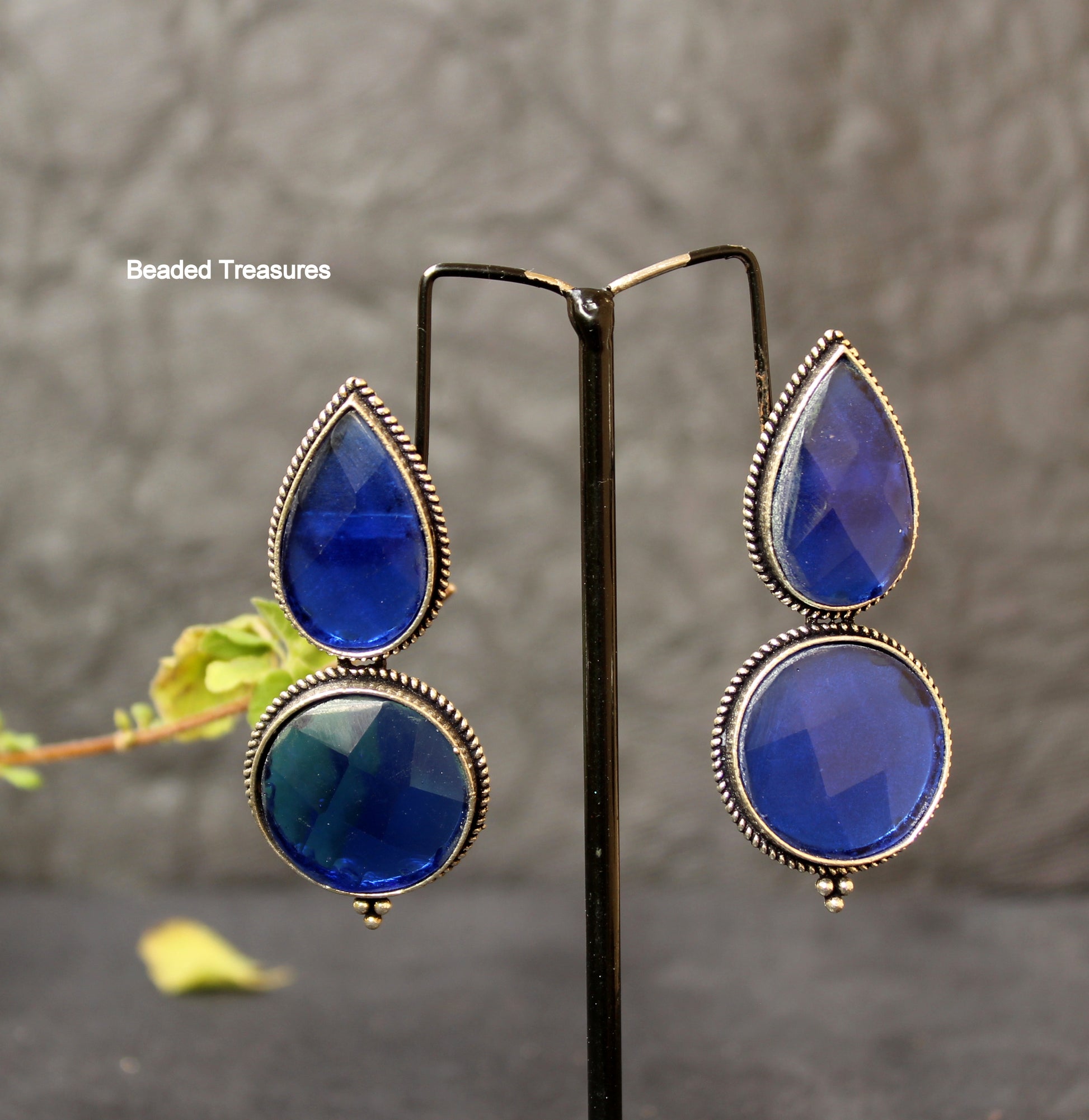 - Elegant and stylish Dangle Earrings featuring deep blue stones set in a beautiful oxidized sterling silver frame, handcrafted by Beaded Treasures in Bengaluru.